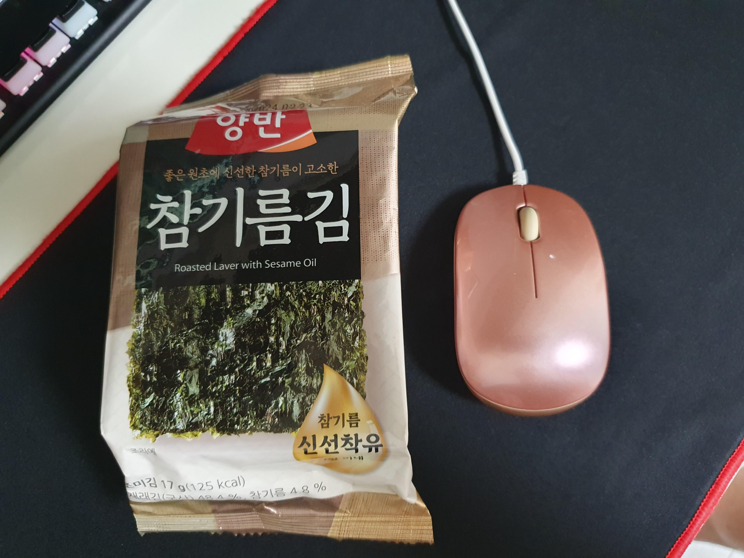 근데 내가 생각한 사이즈가 아니어서 놀랐는데 아... 어쩐지 가격이ㅋㅋ;; '어? 이 가격이 아닐텐데?' 했는데 용량이 많은 김이었다. 크기가 어떤지 체감을 위해서 옆에 마우스를 놔뒀으니 비교해서 보면 되겠다.