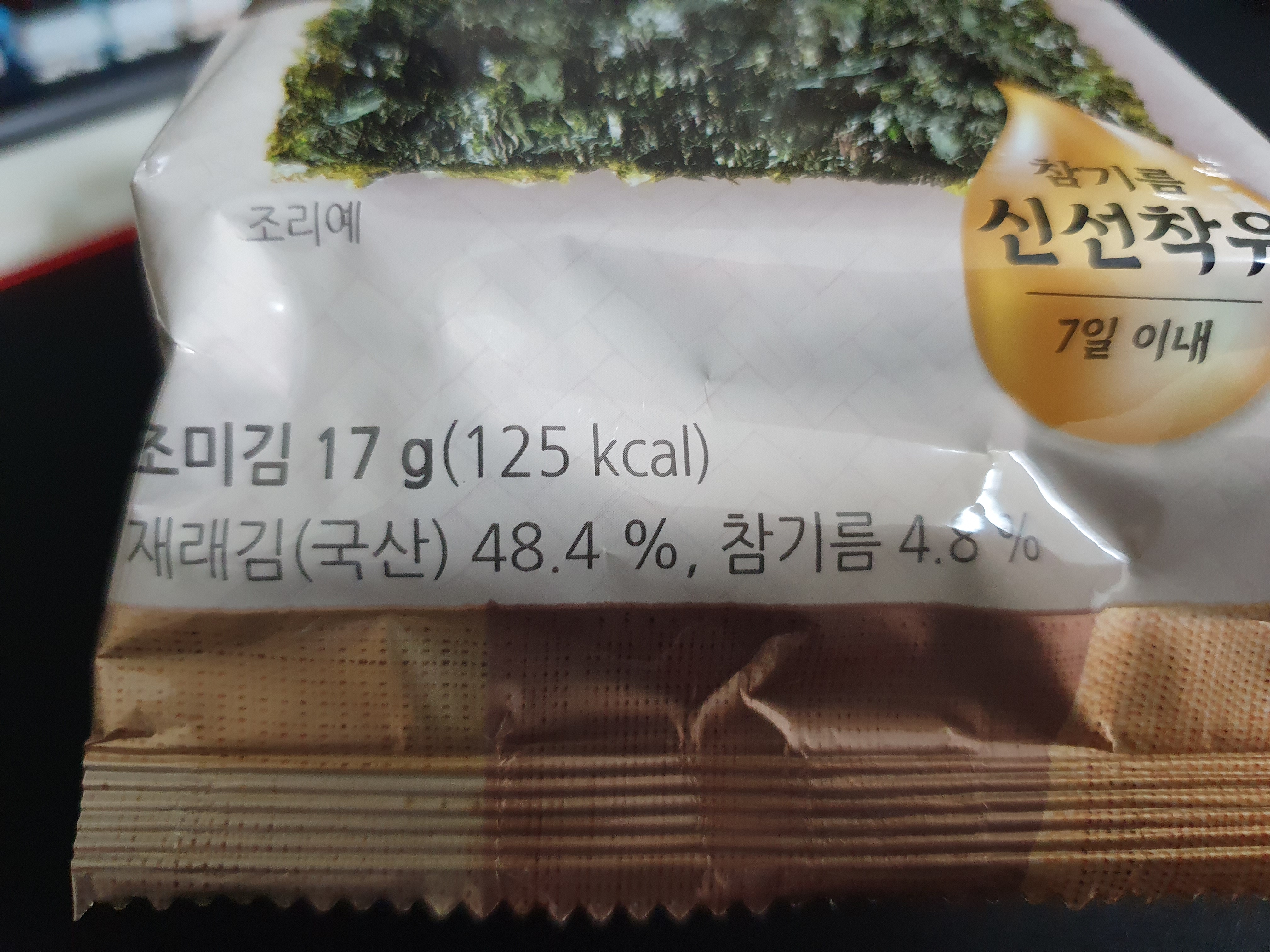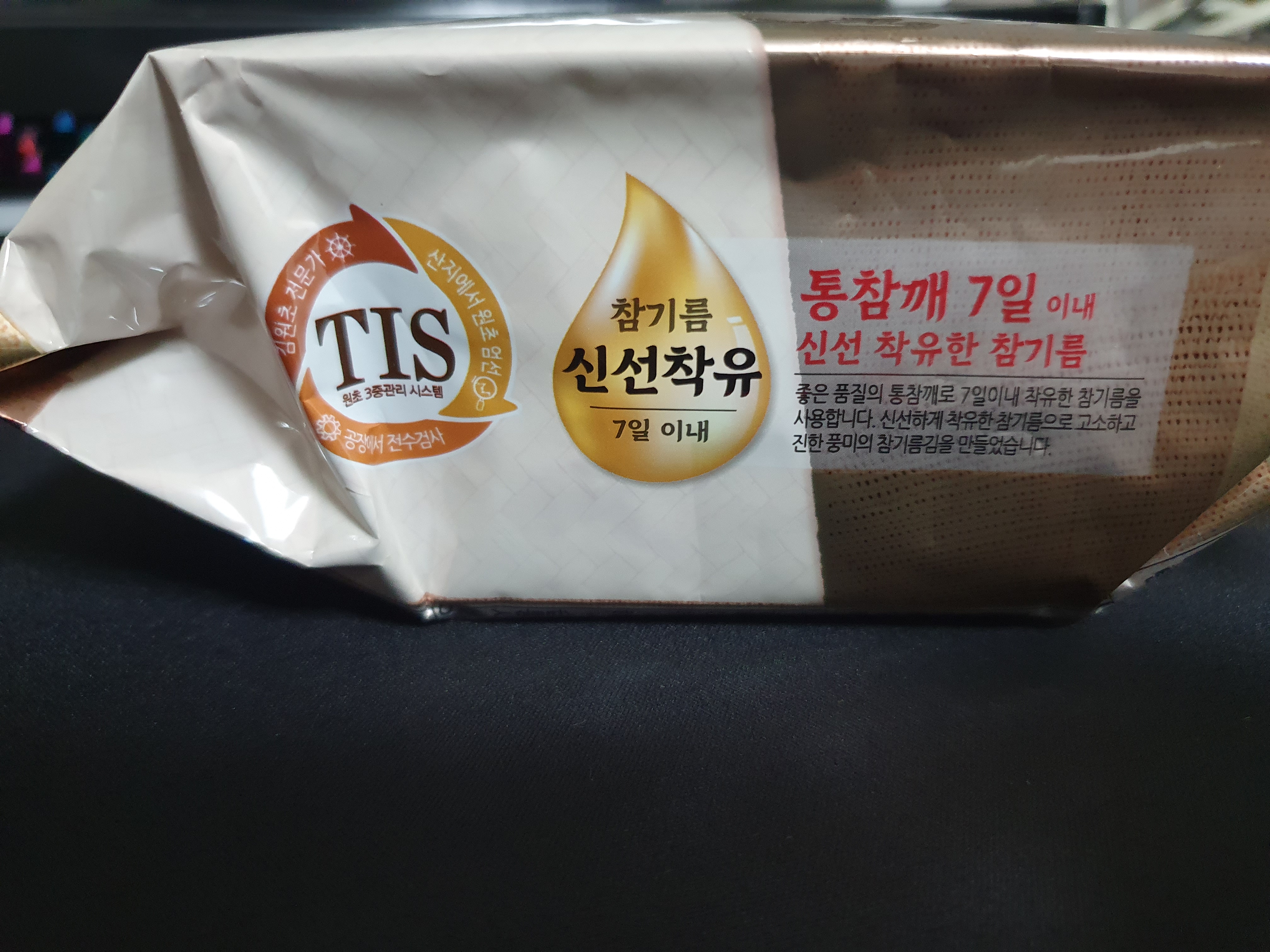 김은 국산 재래김 45.4%를 사용했다고 하고 참기름 4.8%가 들어간다고 한다. 신선착유라고 하는데 착유가 기름을 짰다는 거니까 신선한 참기름을 짜내서 7일이내에 사용했다는 그런 얘기인 것 같다. 아님 말고.
