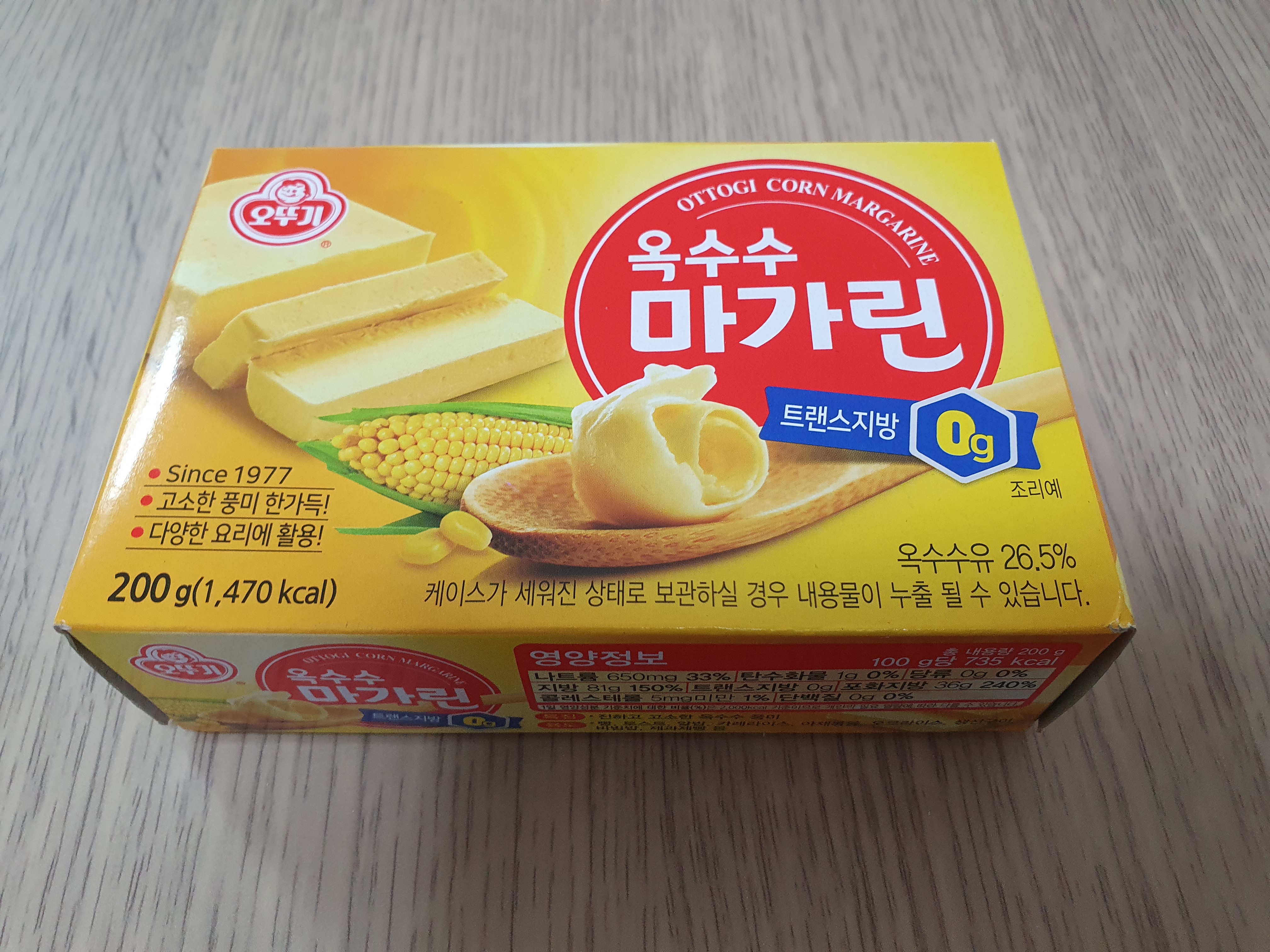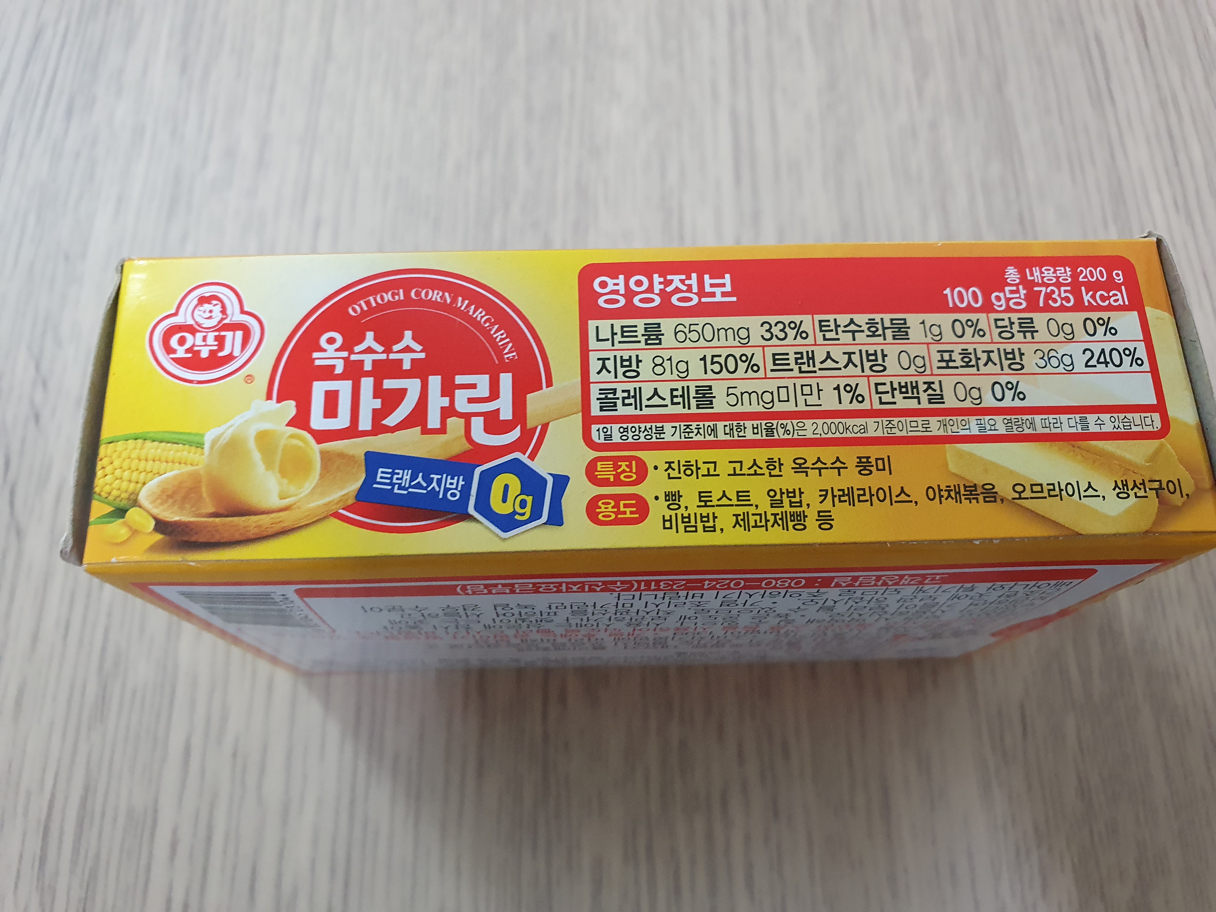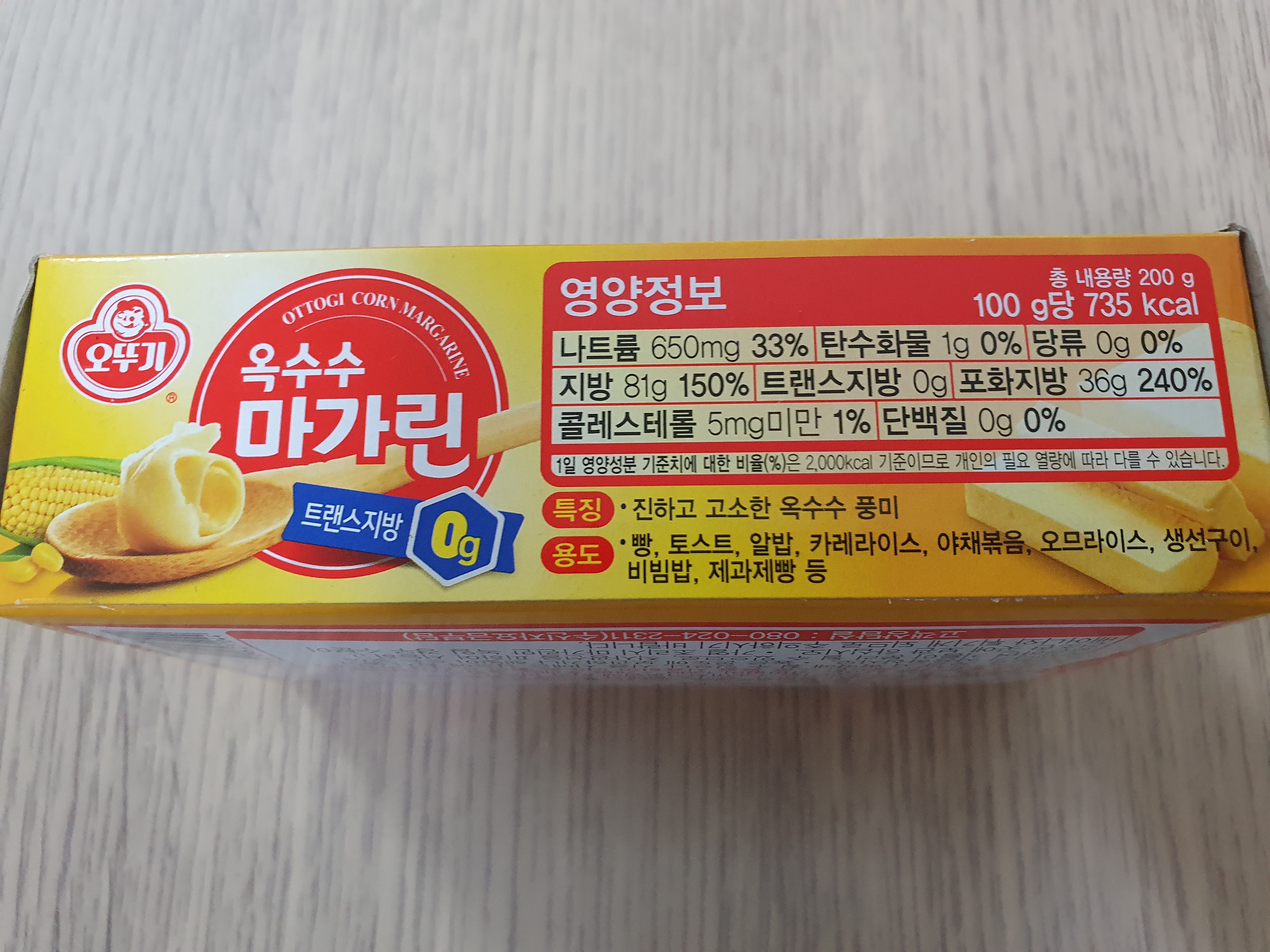 나트륨 650mg, 탄수화물 1g, 지방 81g, 포화지방 36g, 콜레스테롤 5mg미만 들어간다고 되어있다. 특징이 진하고 고소한 옥수수의 풍미라고 되어있다. 가장 큰 특징인 게 맞다.