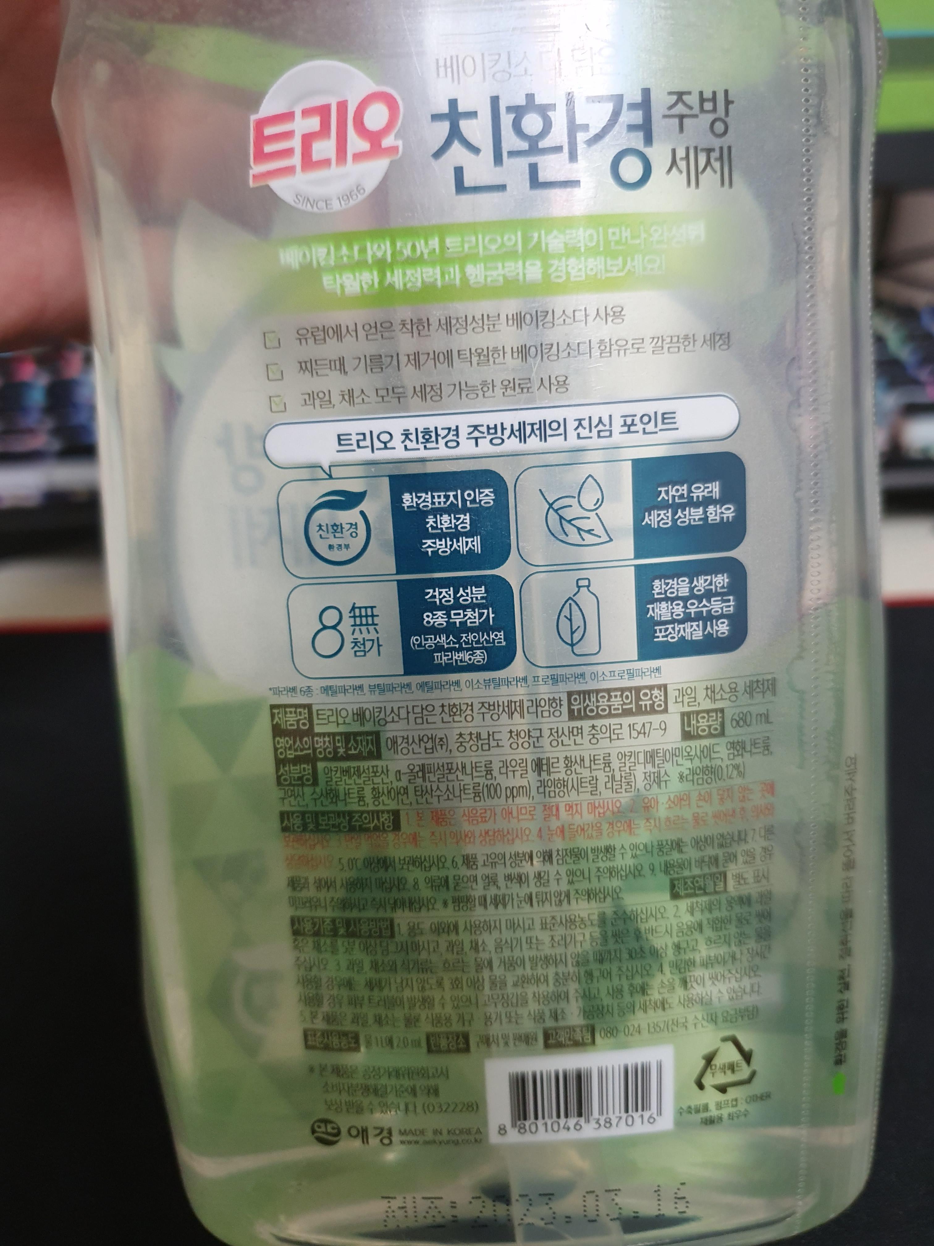 확실히 저렴한 건 거품이 잘 안나서 문제가 되었는데 베이킹소다 담은 친환경 주방세제는 거품도 잘나고 잘 닦이고 향도 좋았다. 그리고 개인적으로 세제 관련해서는 베이킹소다 함유된 것을 선호하는데 베이킹소다도 담겨있어서 좋았다.