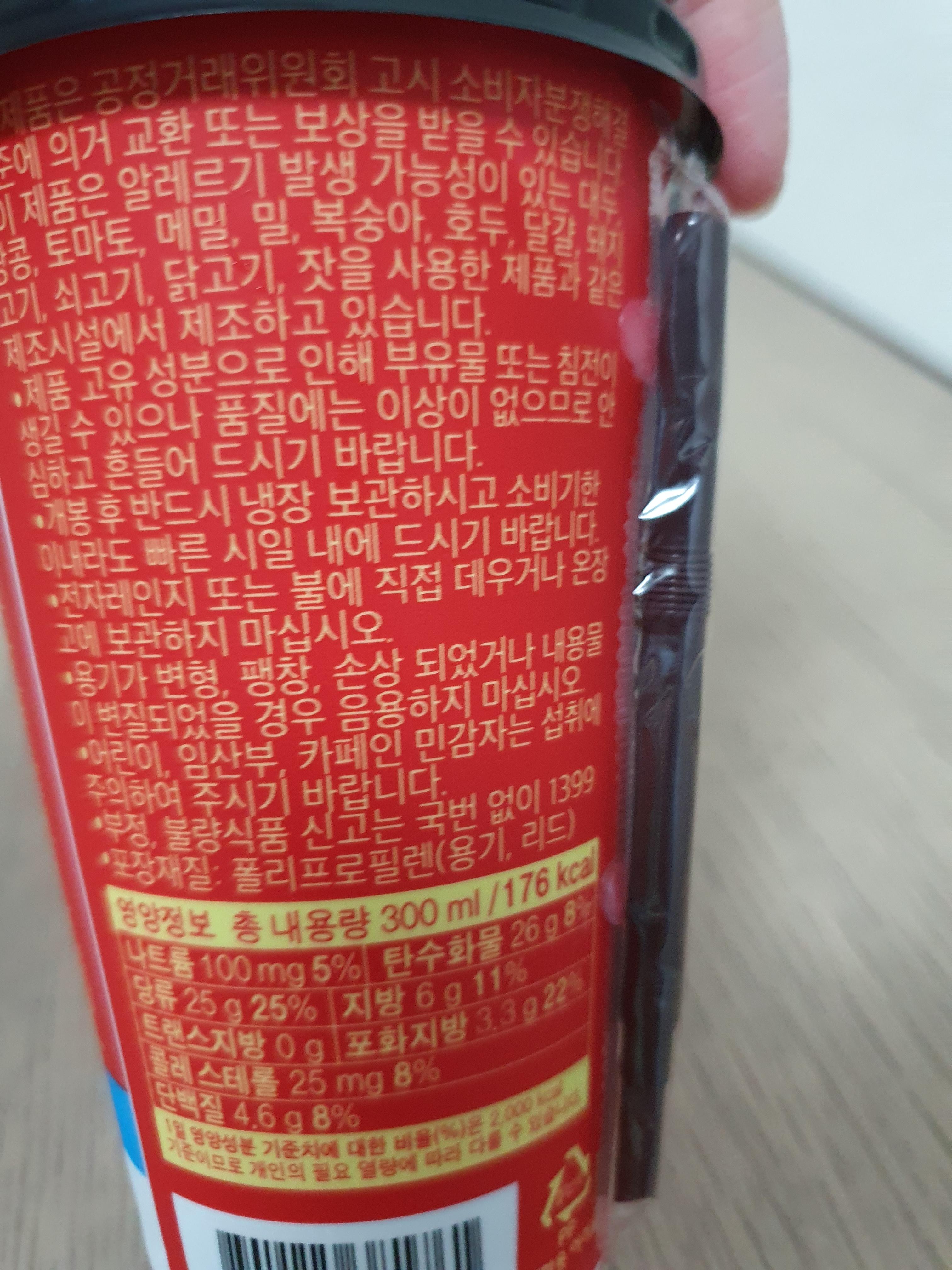 나트륨 100mg, 탄수화물 26g, 당류 25g, 지방 6g, 포화지방 3.3g, 콜레스테롤 25mg, 단백질 4.6g이 있다. 당충전보다는 살짝 허기진 배를 채워주는 느낌이 아주 살짝 있다.