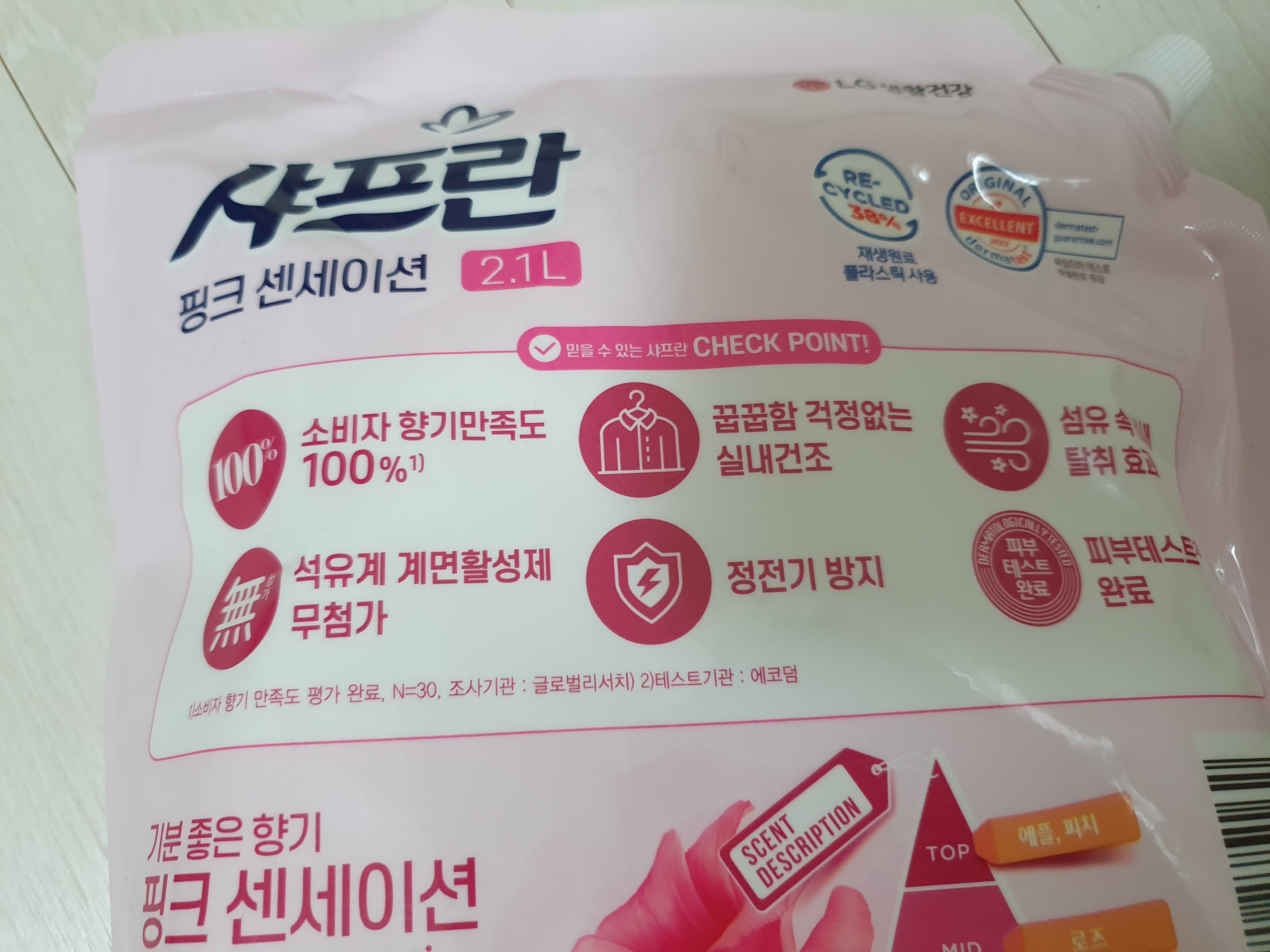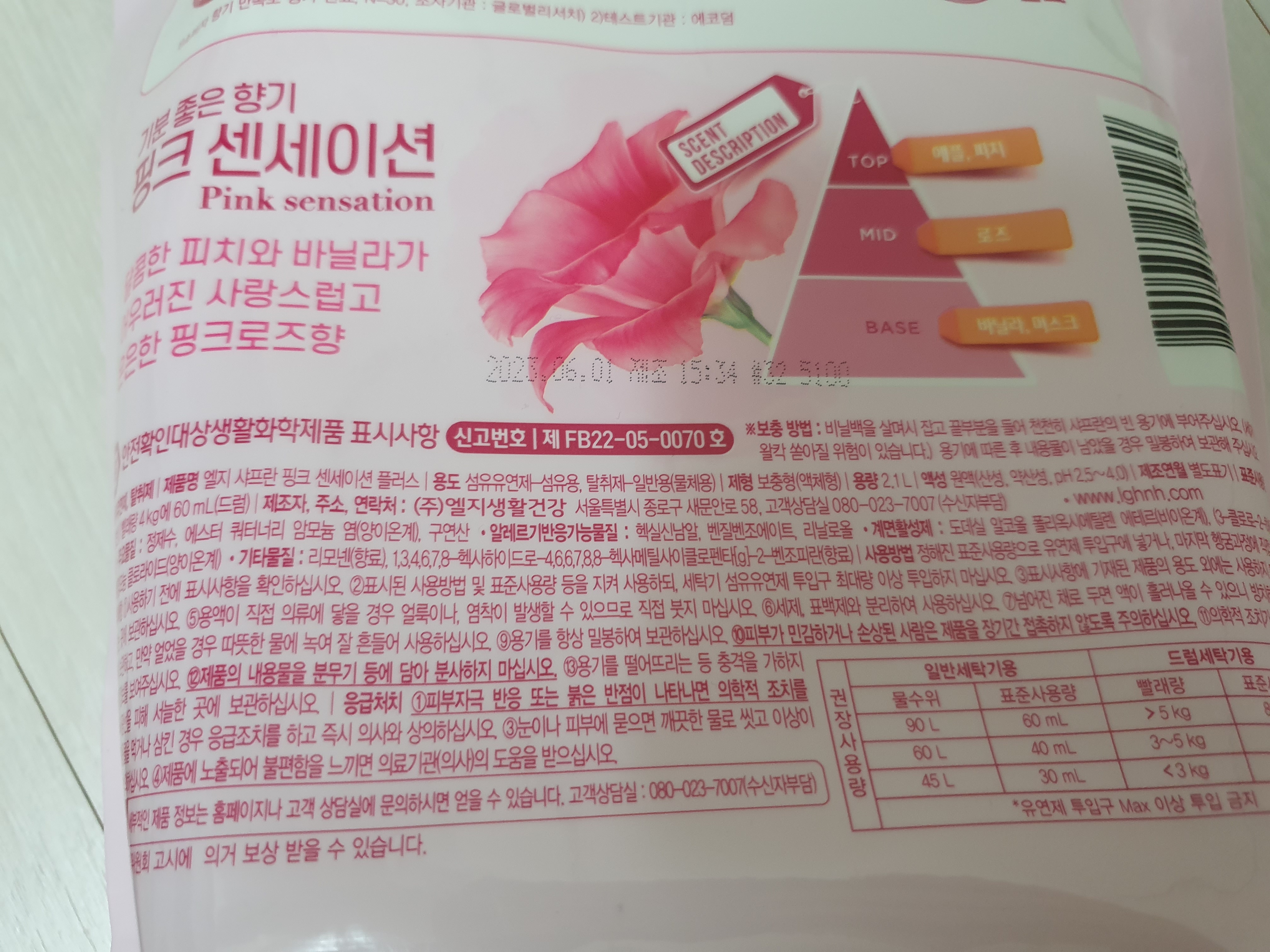 섬유에 전혀 문제가 없었고 피부에도 문제가 없었다. 무엇보다도 샤프란 핑크 센세이션 향이 강력하다. 섬유유연제를 사용하는 사람들은 섬유를 부드럽게 해주기 위함도 있지만 사실 '향 때문'인 사람들도 많다.