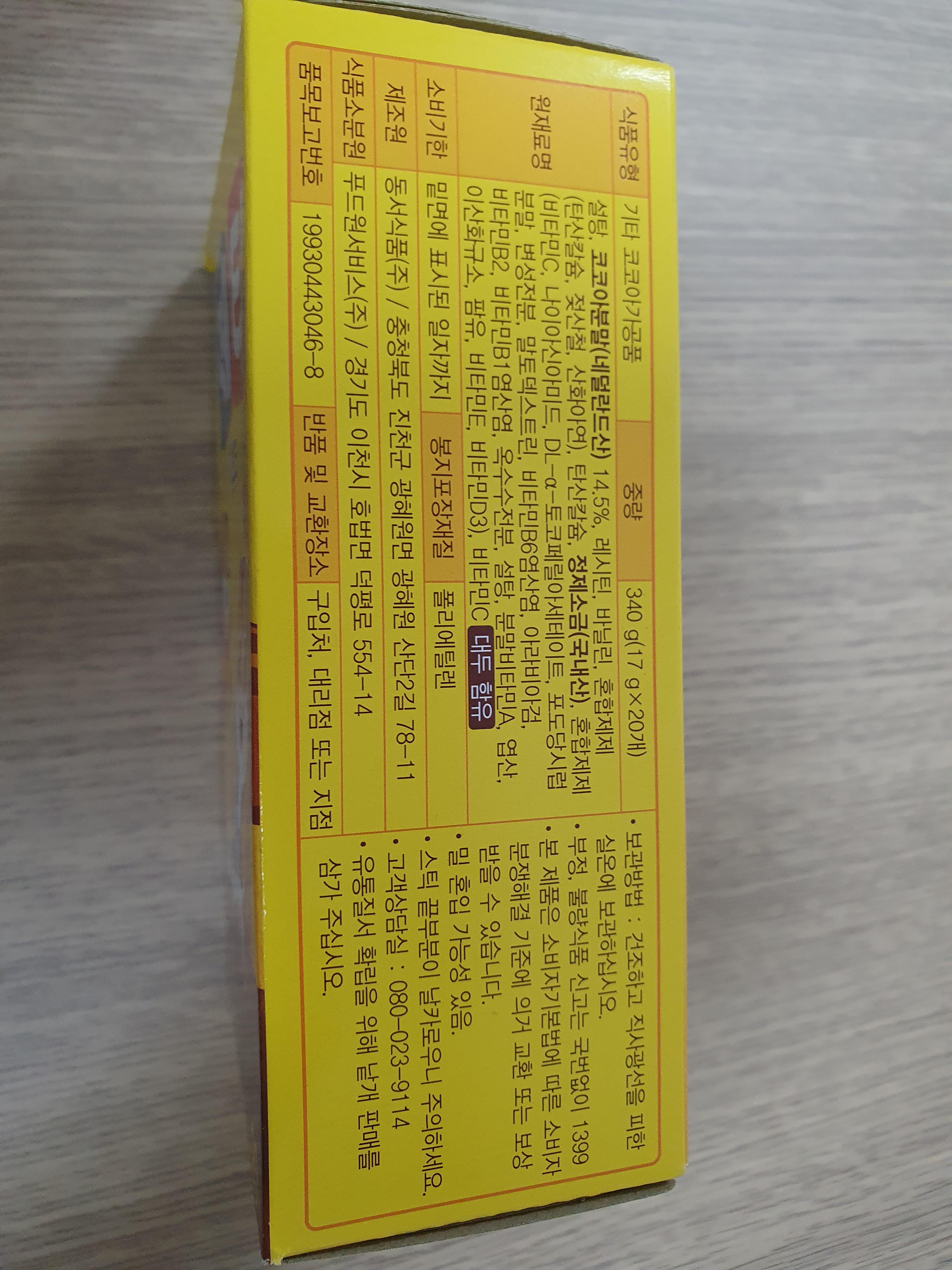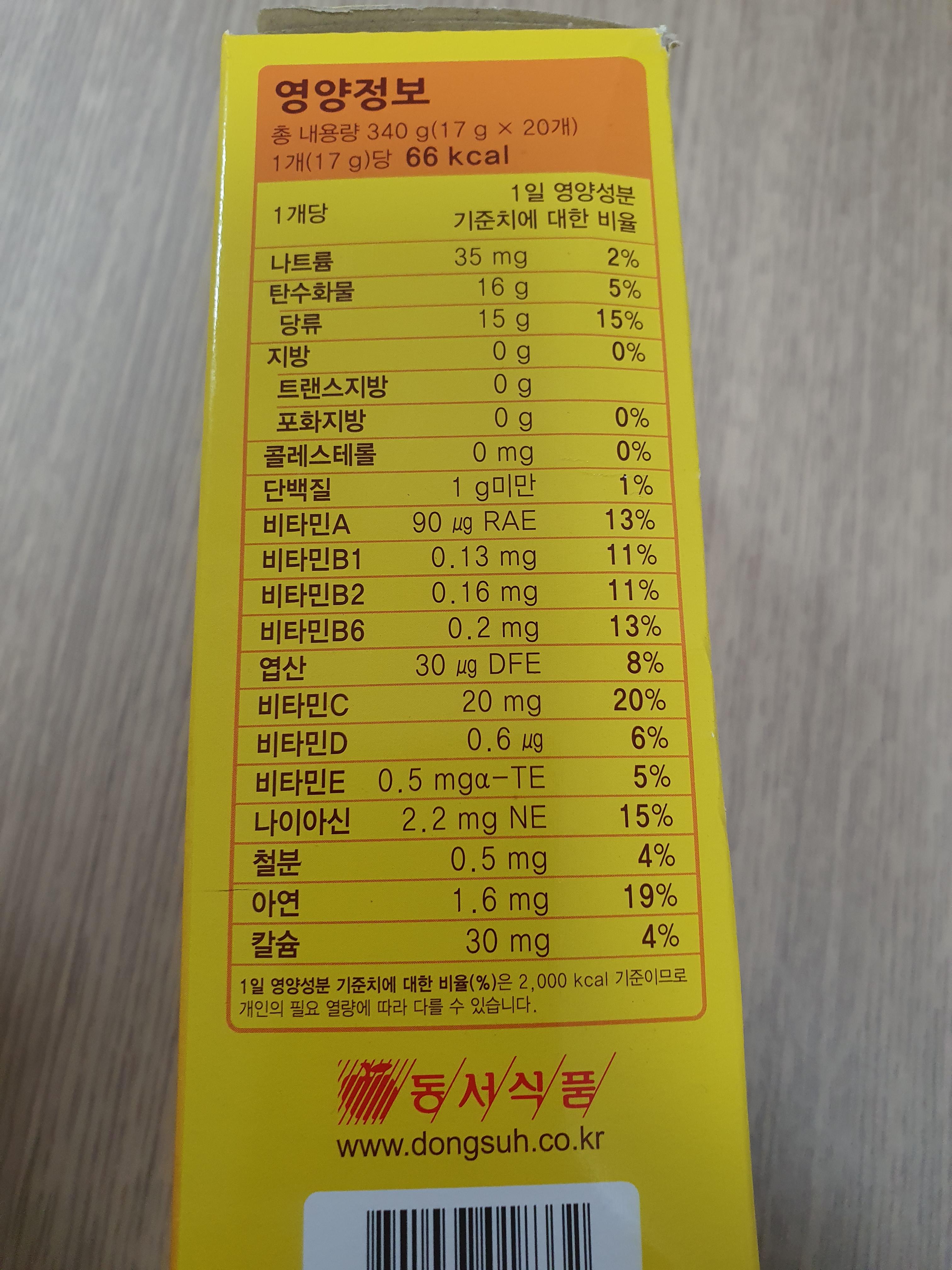 20개 들어있는 것이고 가격은 4600원 정도 한다. 총합 칼로리는 1320칼로리이지만 20개 들었고 개당 17g으로 66칼로리씩 된다. 우유 마시면서 당분 보충 정도이고 9가지 비타민이 첨부되어있다고 한다. 철분, 아연, 칼슘 등등