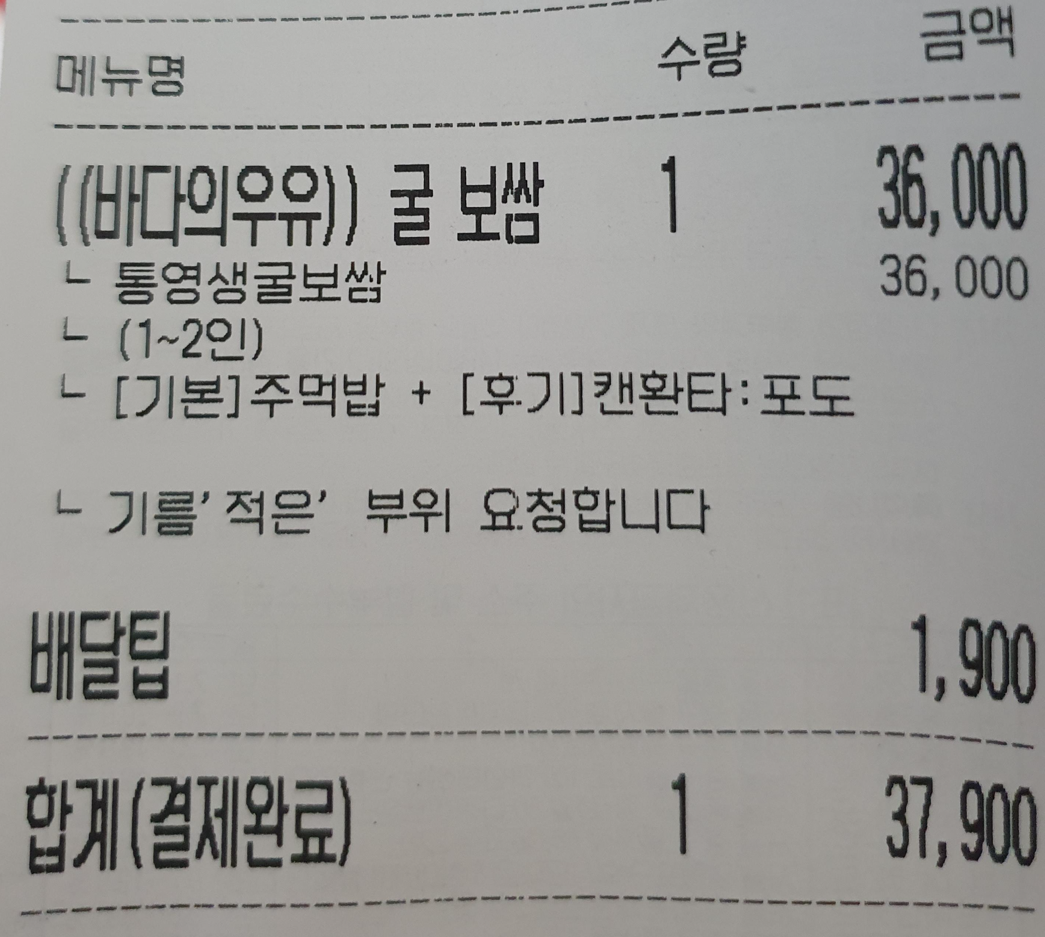 바다의우유라고 하는 굴을 주는 통영생굴보쌈의 가격은 36000원이다. 배달팁 1900해서 총합 37900원 나왔다. 사실 막국수도 너무 땡기긴 했는데... 혼자 먹는거라 참아야만 했다.