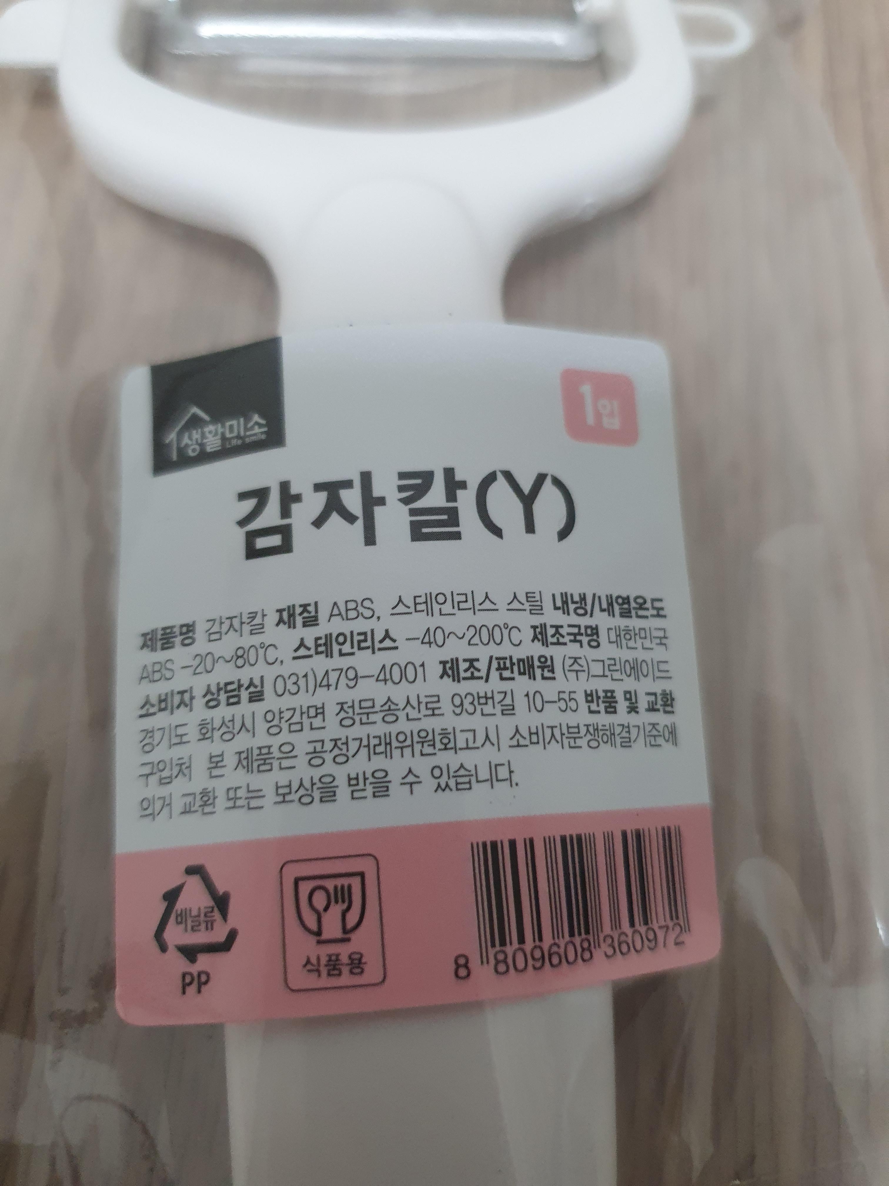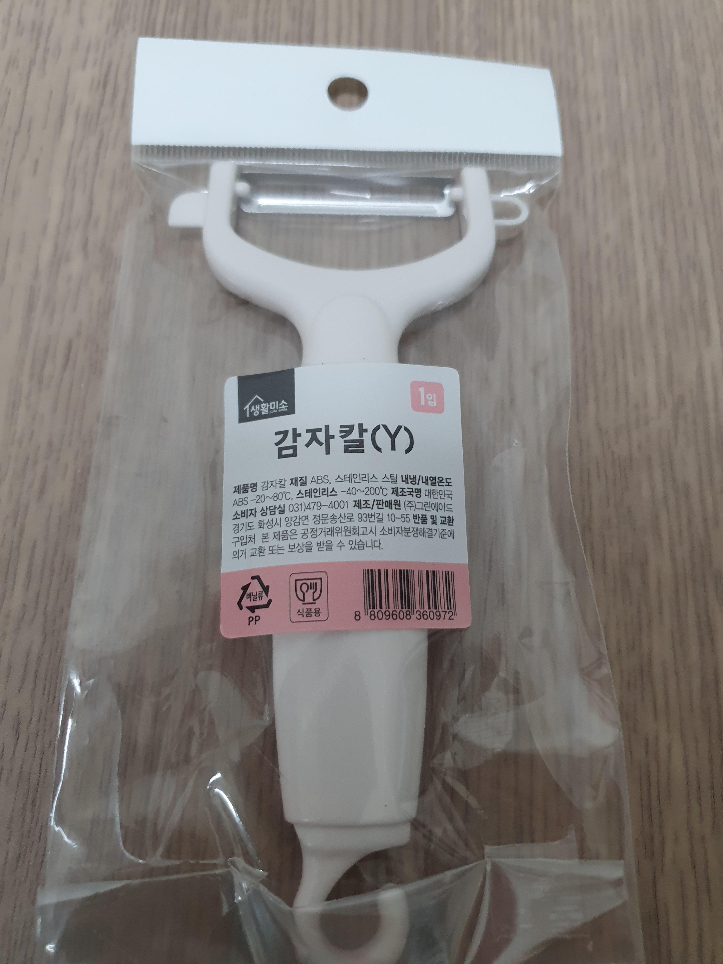 생활미소 감자칼이고 옆에 (Y)라고 되어있는데 이게 그냥 타입을 말하는 것 같다. 식품용이고 다들 아는 그 감자 깎는 칼이다. 재질은 ABS, 스테인리스 스틸이라 되어있다.
