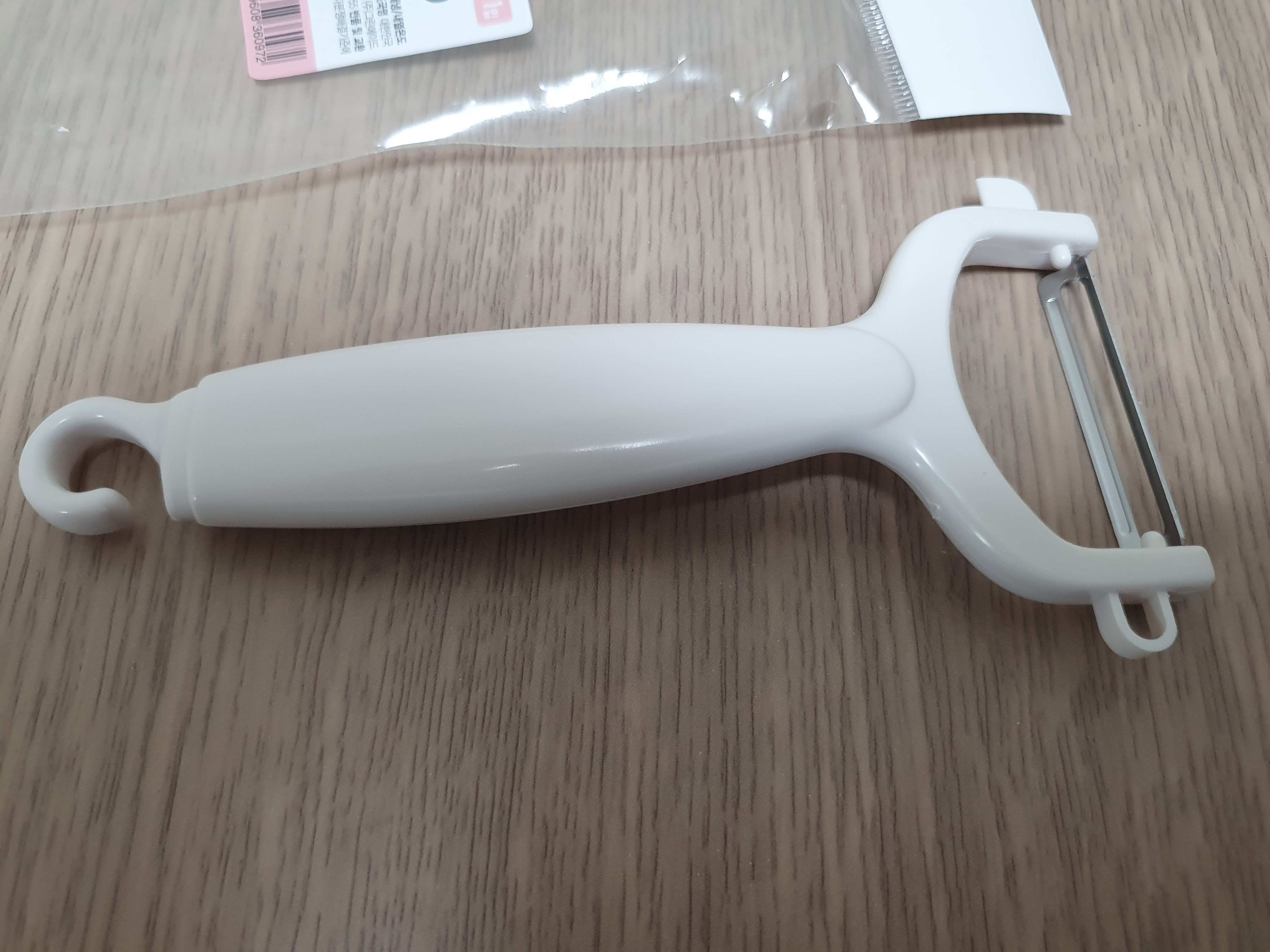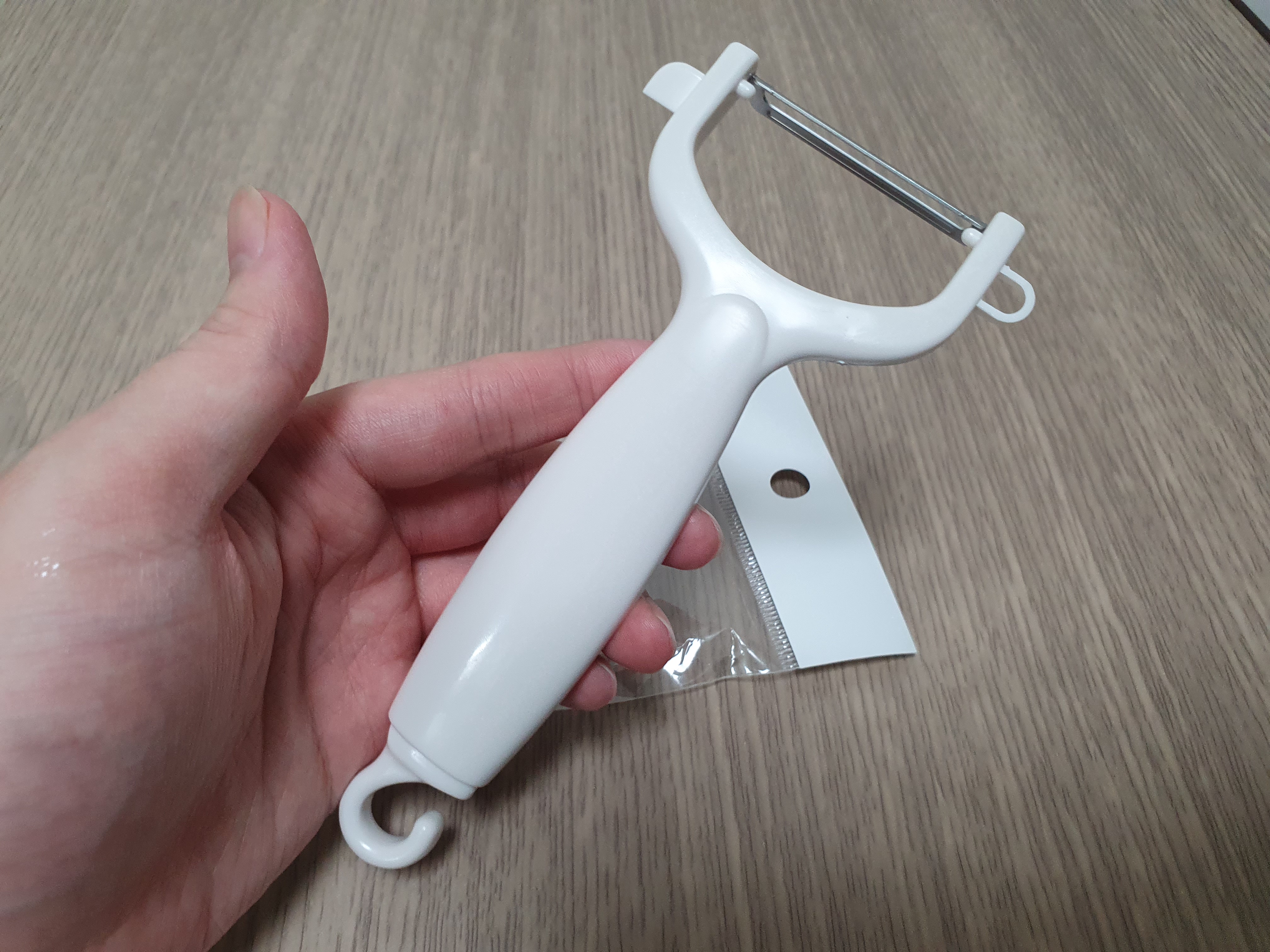 생활미소 감자칼은 크지도 작지도 않은 적당한 사이즈이다. 일반적으로 가정에서 사용하기 가장 알맞은 사이즈라고 보면 될 것 같다. 그립감 좋았고 끝부분에 고리 형태로 만들어놔서 걸어두기도 편했다.