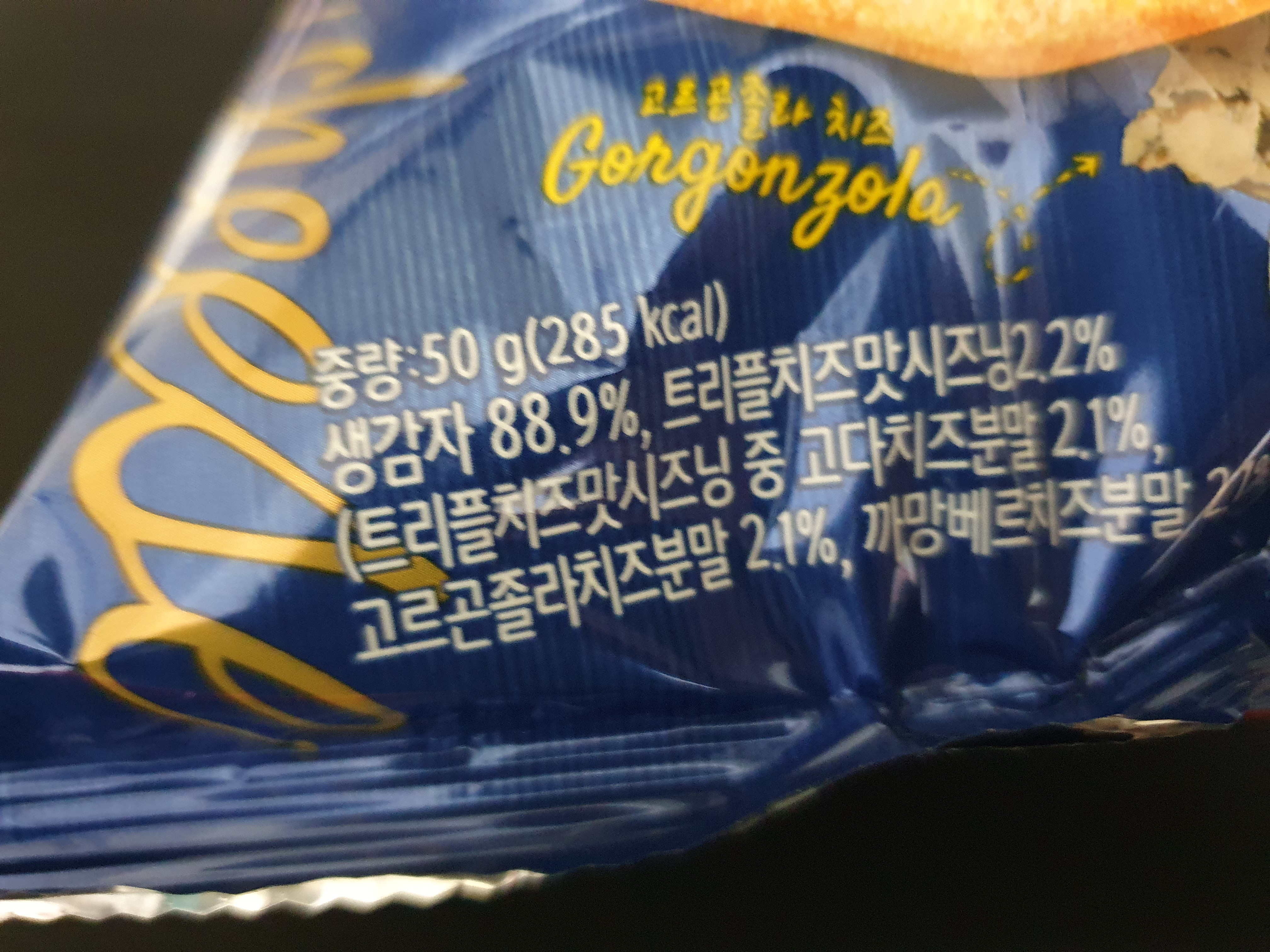 생감자 88.9%, 트리플치즈맛시즈닝 2.2%(고다치즈분말 2.1% 포함), 고르곤졸라치즈분말 2.1%, 까망베르치즈분말 2.1%가 포함되어있다.