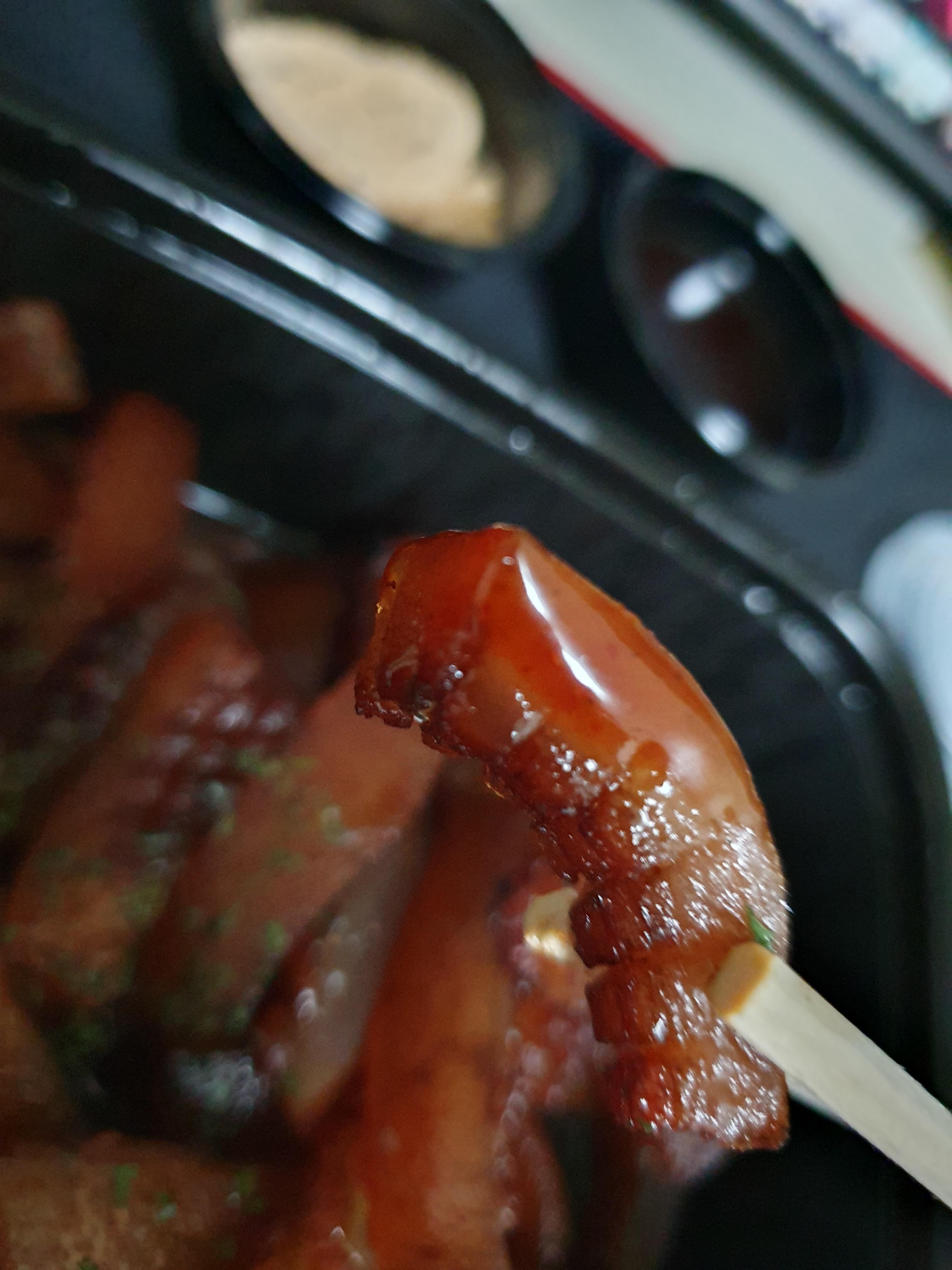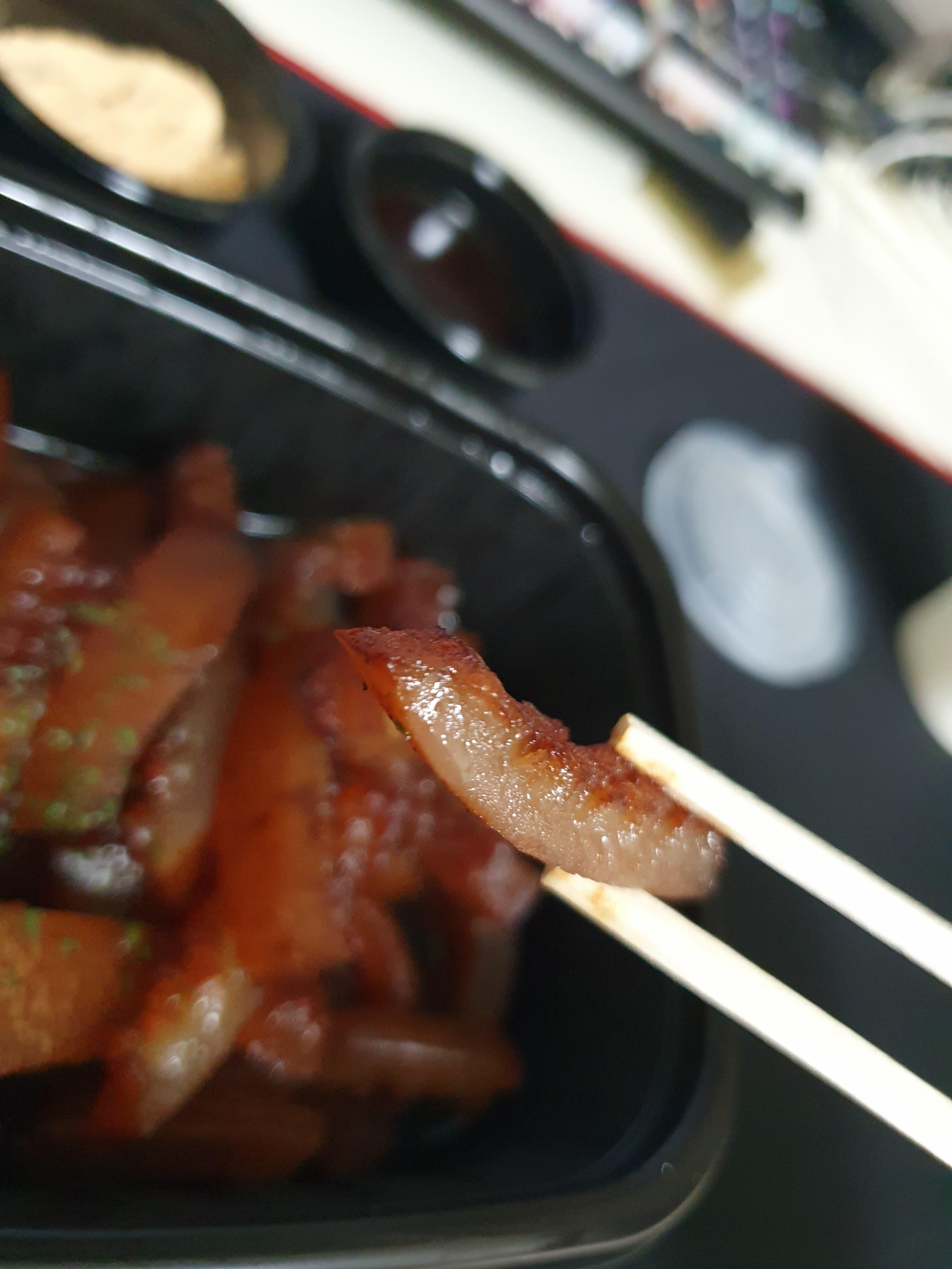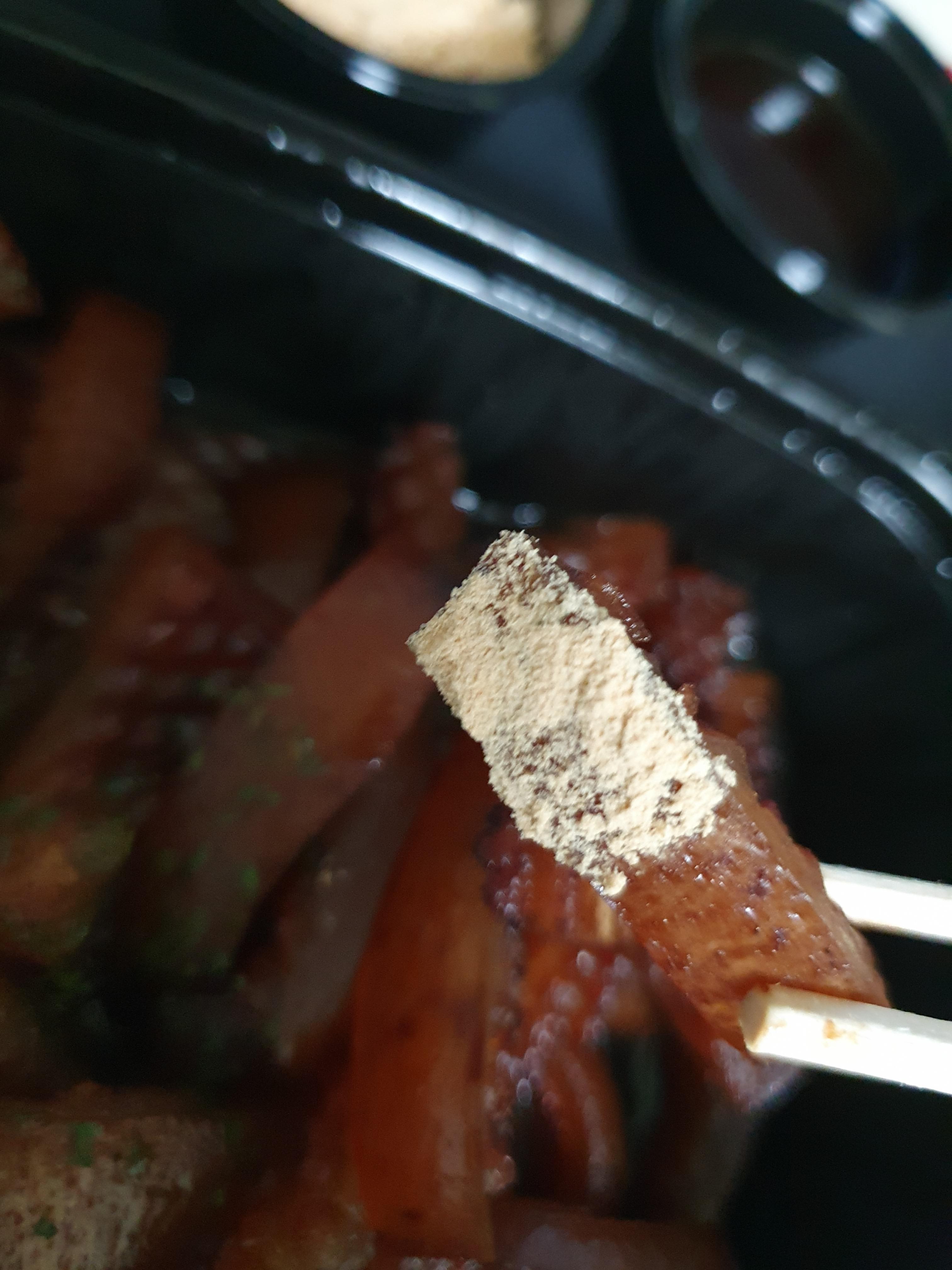콩가루하고 매운숯불소스를 같이 주어서 찍어먹는 재미가 있고 매운숯불소스가 맛있어서 다음에 고기 주문할 때 양념고기를 주문해도 괜찮겠단 생각이 들었다.