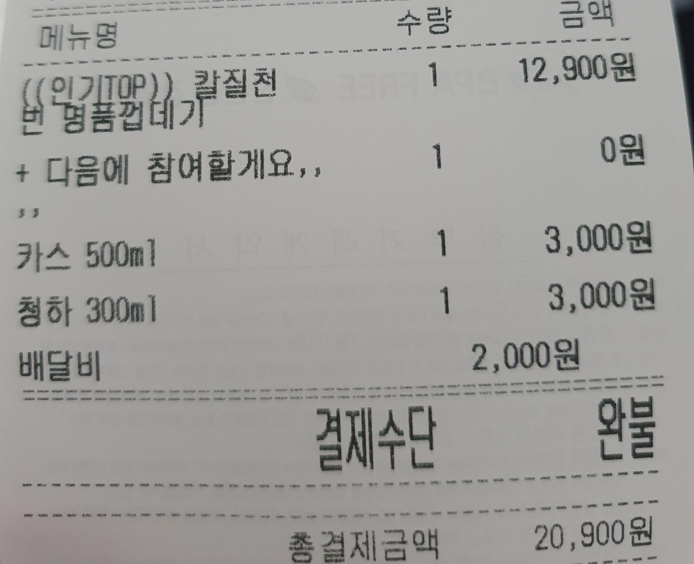 배달비는 2000원 나와서 총합 20900원 나왔다. 껍데기에 한잔 걸치기 완성!