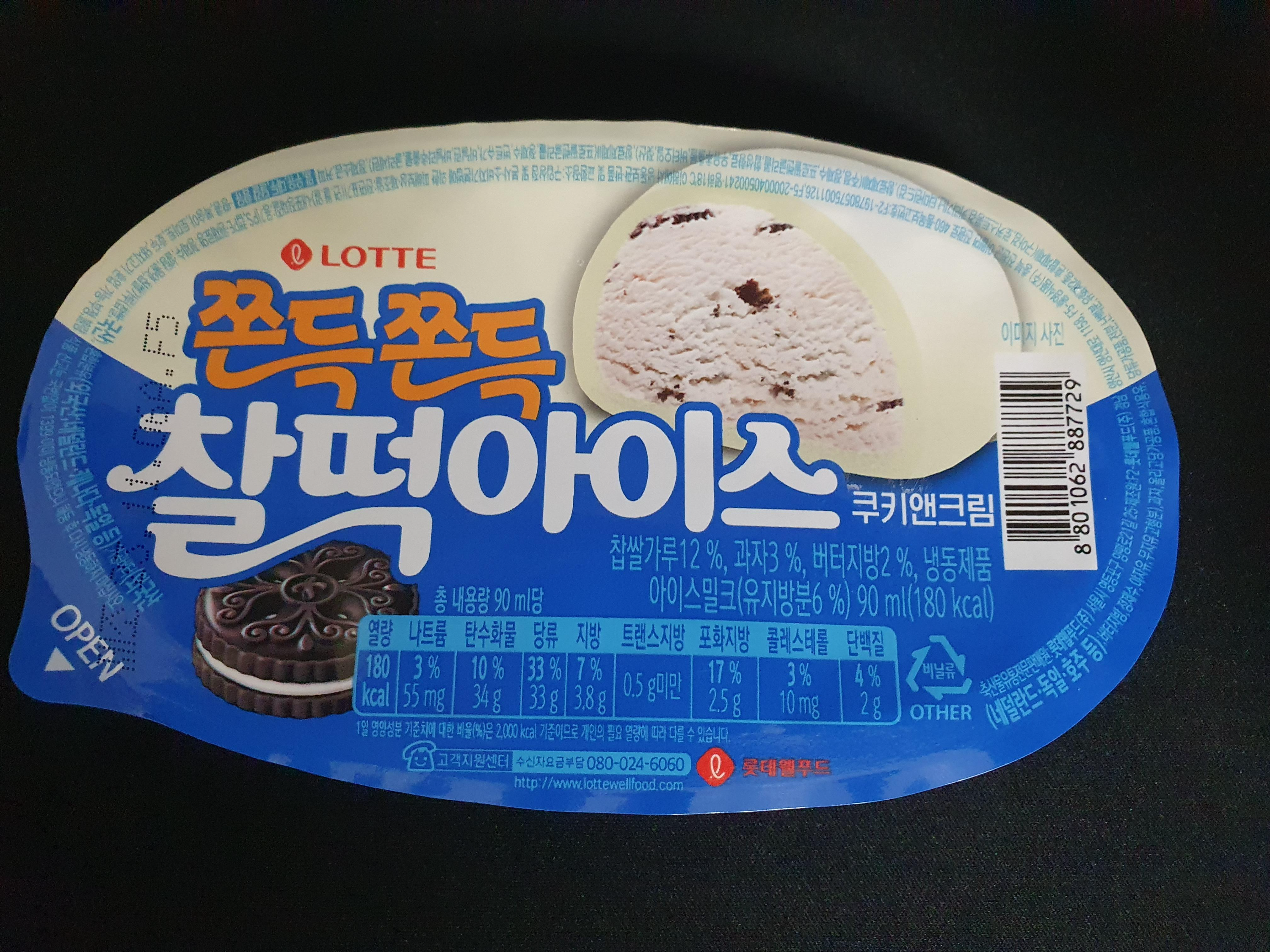 롯데 쫀득쫀득 찰떡아이스 쿠키앤크림은 새로운 버전인데 4개 묶음으로 구매해서 다 아주 맛있게 먹었다. 찰떡과 쿠키앤크림의 조합이라... 좋은데?