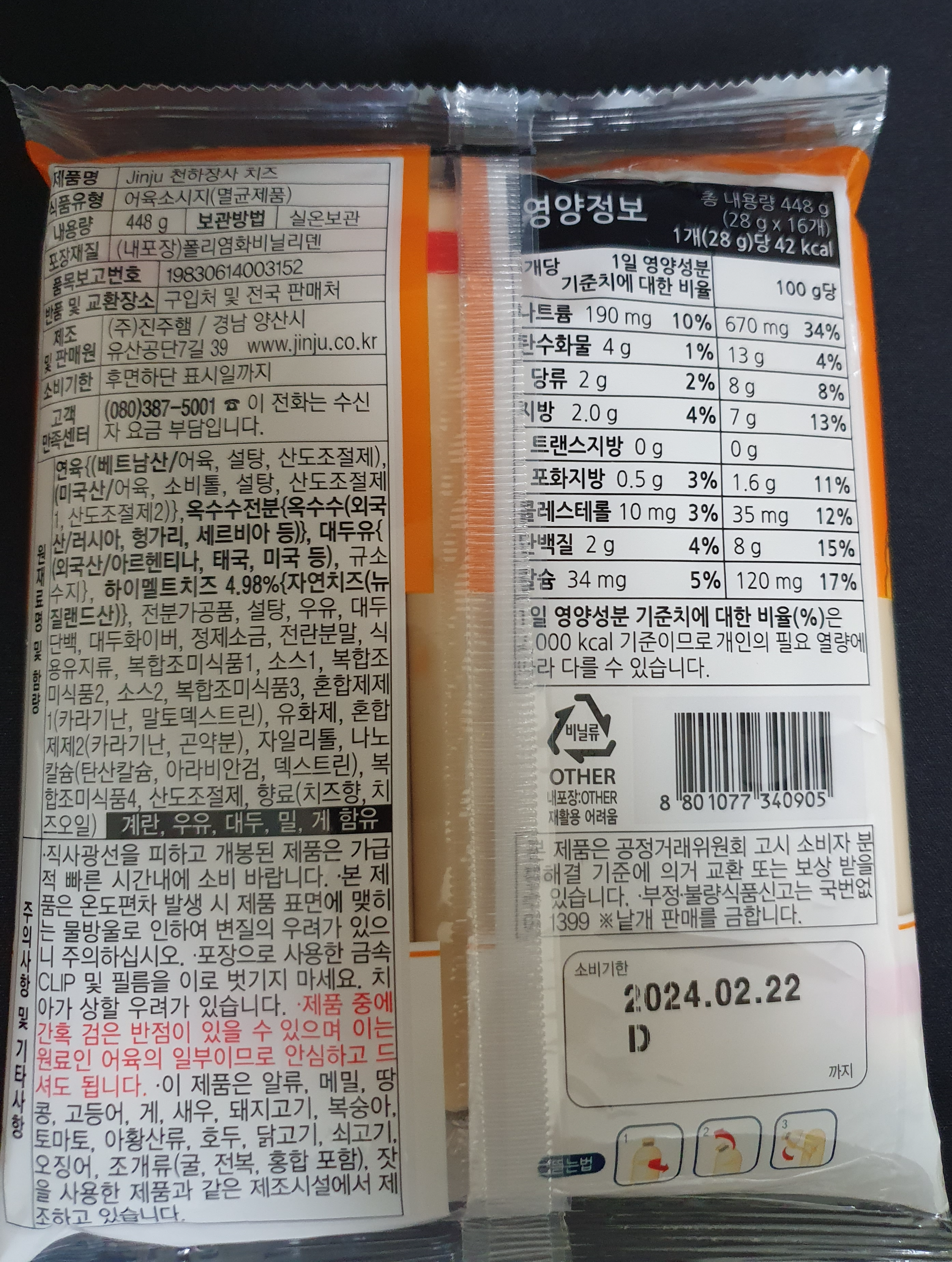 가격은 7000원 정도한다. 총 448g이고 16개 들어있는 제품이다. 설명에 하이멜트 치즈 4.98%가 함유되어있다고 한다. 하이멜트 치즈가 무엇인고... 궁금해서 찾아보니까 원체 소시지, 빵, 어묵 등에 많이 사용되는 치즈라고 한다.