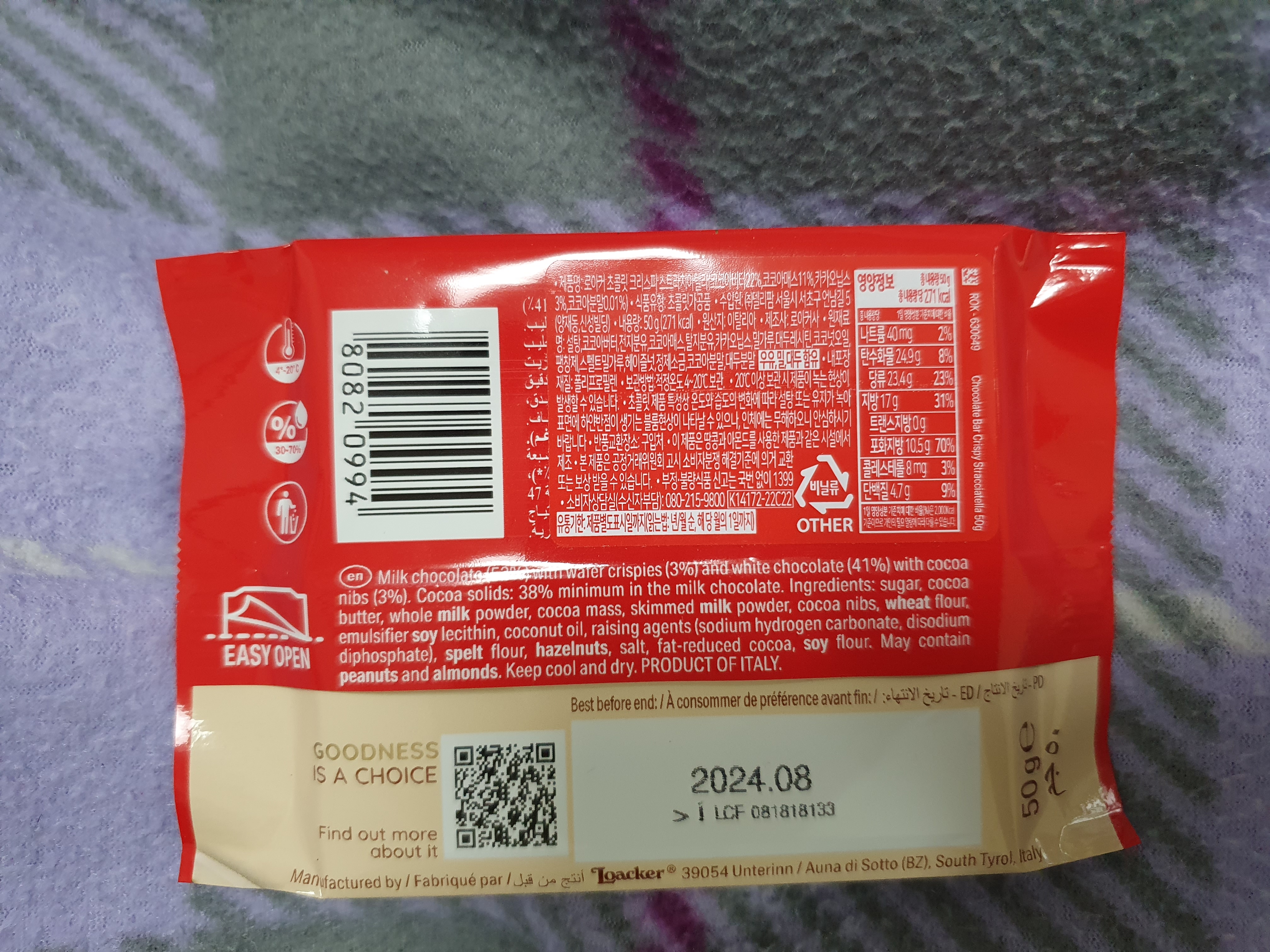 원재료명을 보자면 설탕, 코코아버터, 전지분유, 코코아매스, 탈지분유, 카카오닙스, 밀가루, 대두레시틴, 코코넛오일, 팽창제, 스펠트밀가루, 헤이즐넛, 정제소금, 코코아분말, 대두분말, 우유, 밀, 대두이다.
