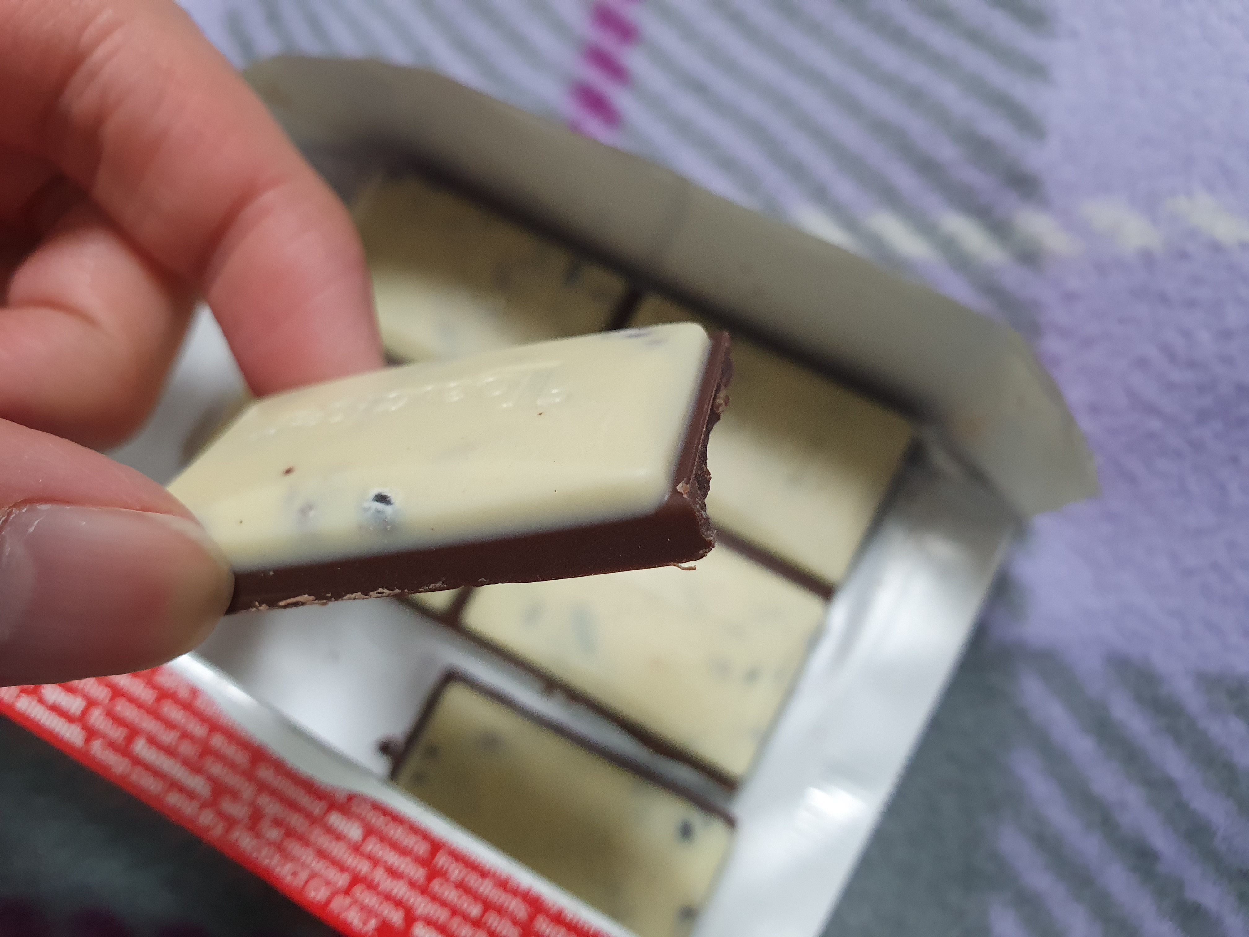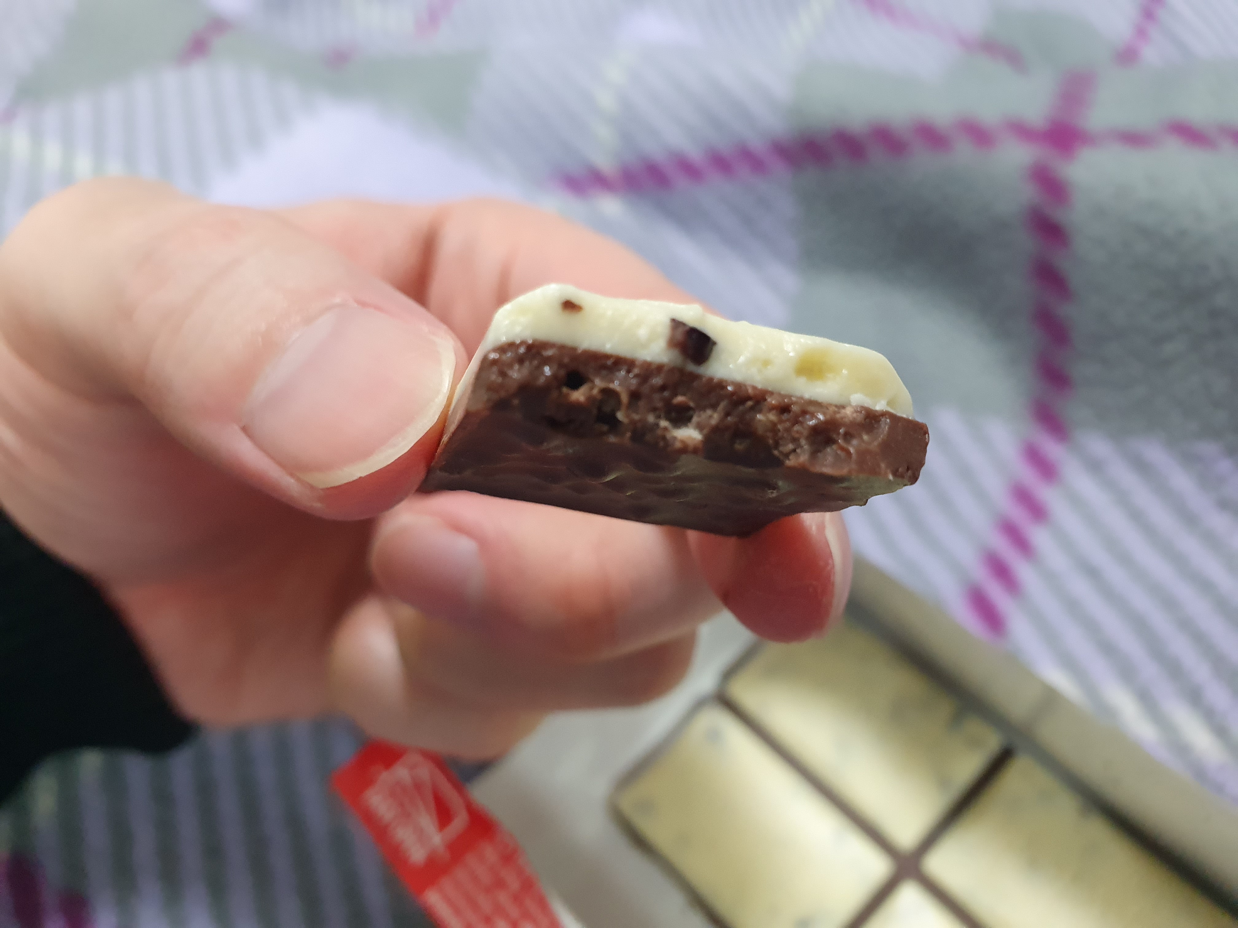 아래쪽은 밀크초코면서 크리스피가 있는 것 같고 화이트초코에는 보다시피 아마도 카카오닙스가 박혀있는 것 같다. 그래서 화이트초코가 독단적으로 맛이 뚫고 나오지 않고 융화가 되어버리는데 그 융화됨이 아주 맛을 한껏 끌어 올려줬다.