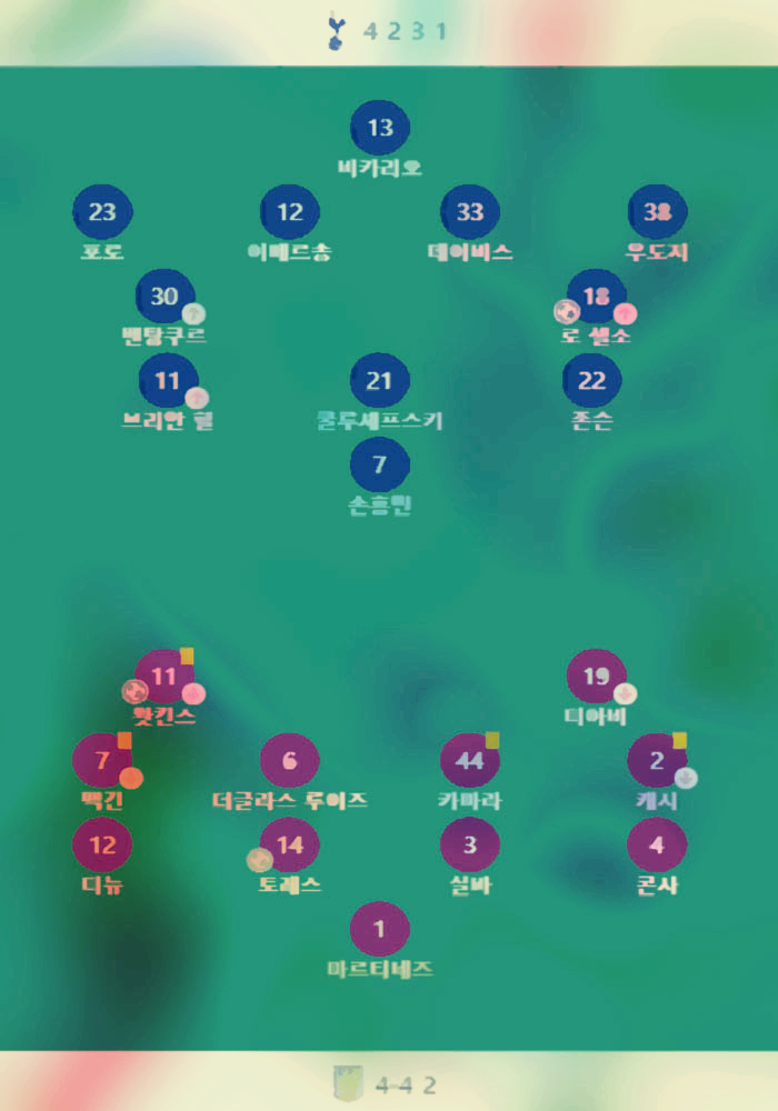 어쩔 수 없이 선발을 계속 기용하다가 '벤탕쿠르'는 부상 때문에 32분에 교체되었고 나머지는 71분, 86분으로 참고 참다가 교체를 하게 된다. 브리안 힐을 스킵으로, 로 셀소를 벨리스로 교체한다... 와우...