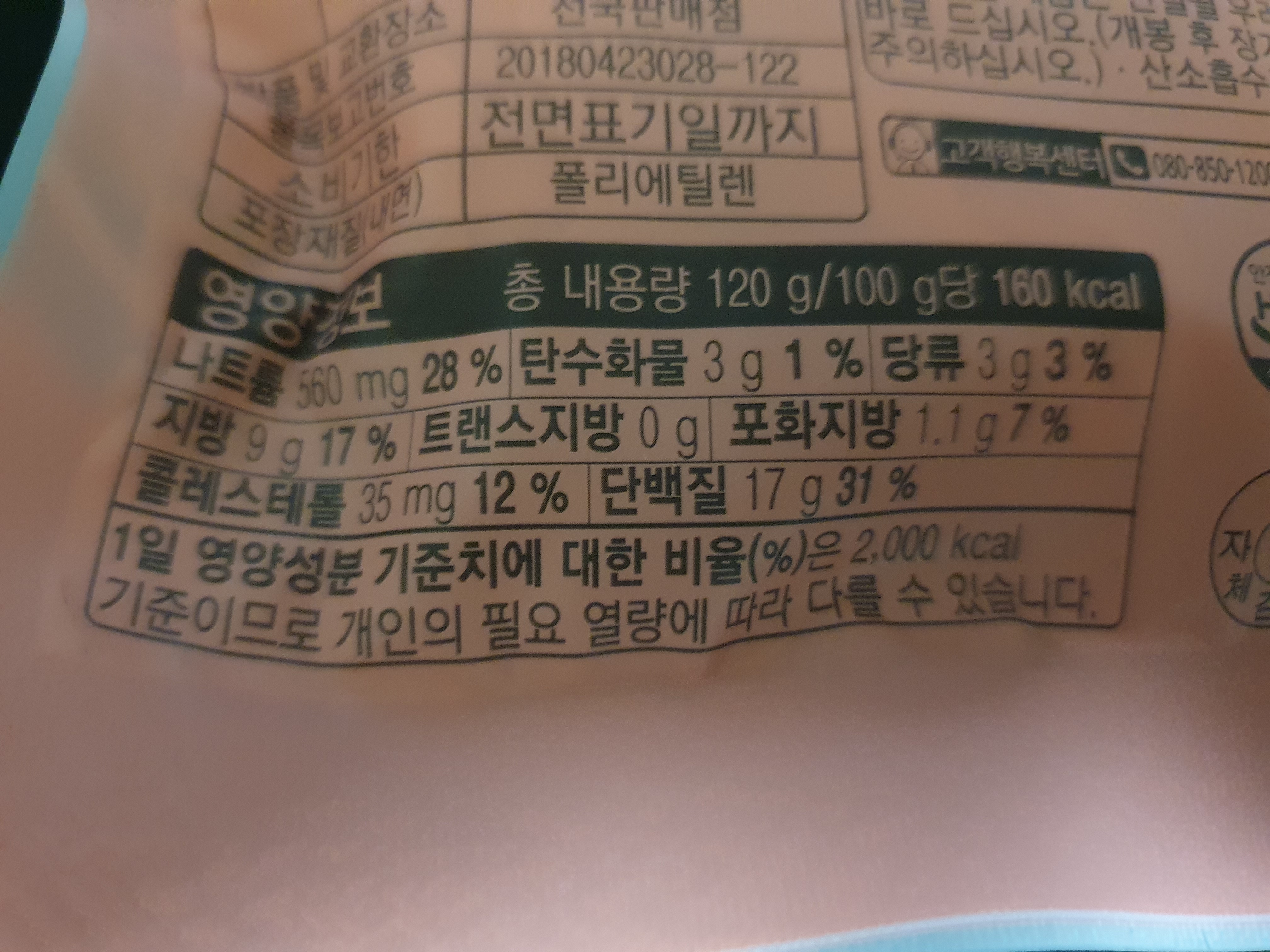 나트륨 560mg, 탄수화물 3g, 당류 3g, 지방 9g, 포화지방 1.1g, 콜레스테롤 35mg, 단백질 17g이 포함되어 있다.