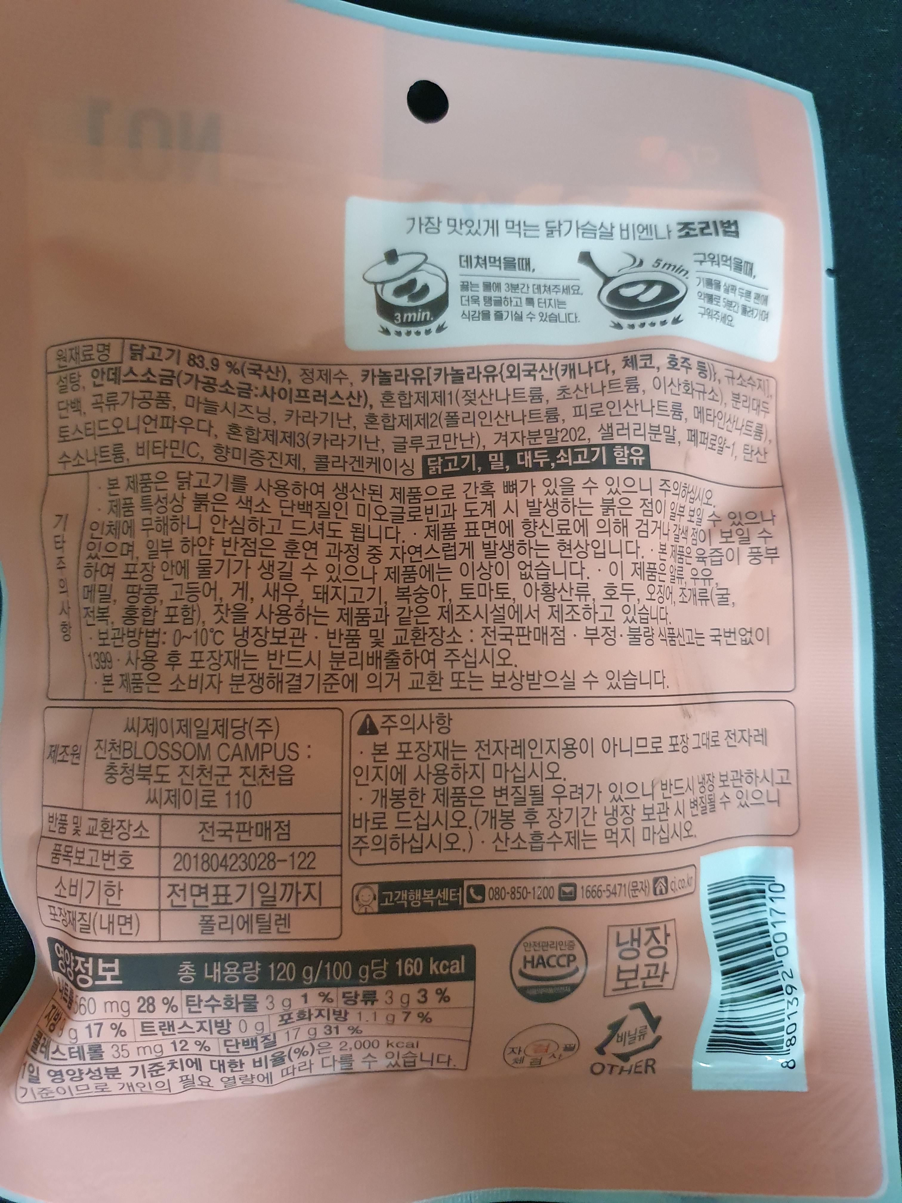 처음 먹어보는 닭가슴살 비엔나 소세지여서 한번 구입해 먹어봤다. 냉장 식품이고 CJ제일제당의 더건강한 시리즈이다. 내가 생각했던 것보다 아주 큼직한 소시지였고 닭가슴살이 들어가서 아무래도 독특하긴 했다.