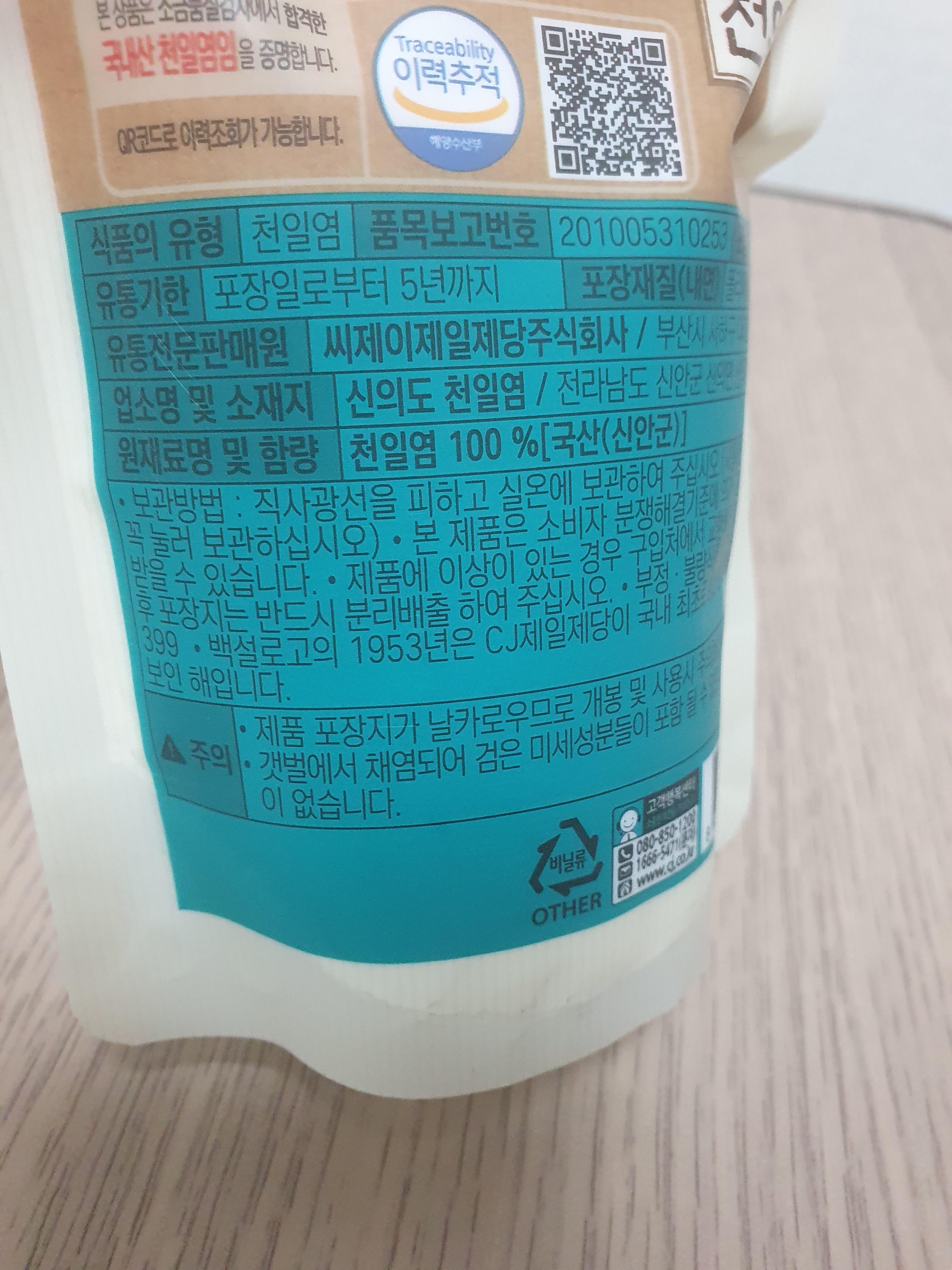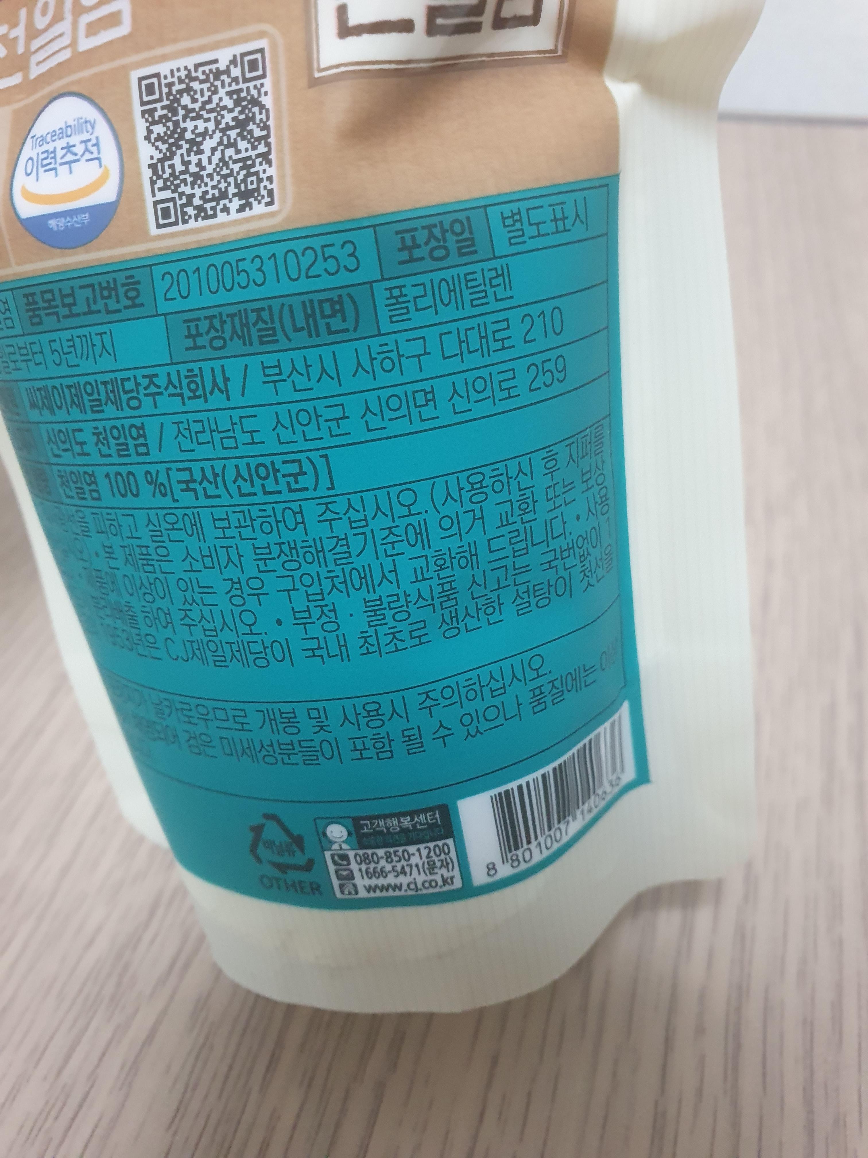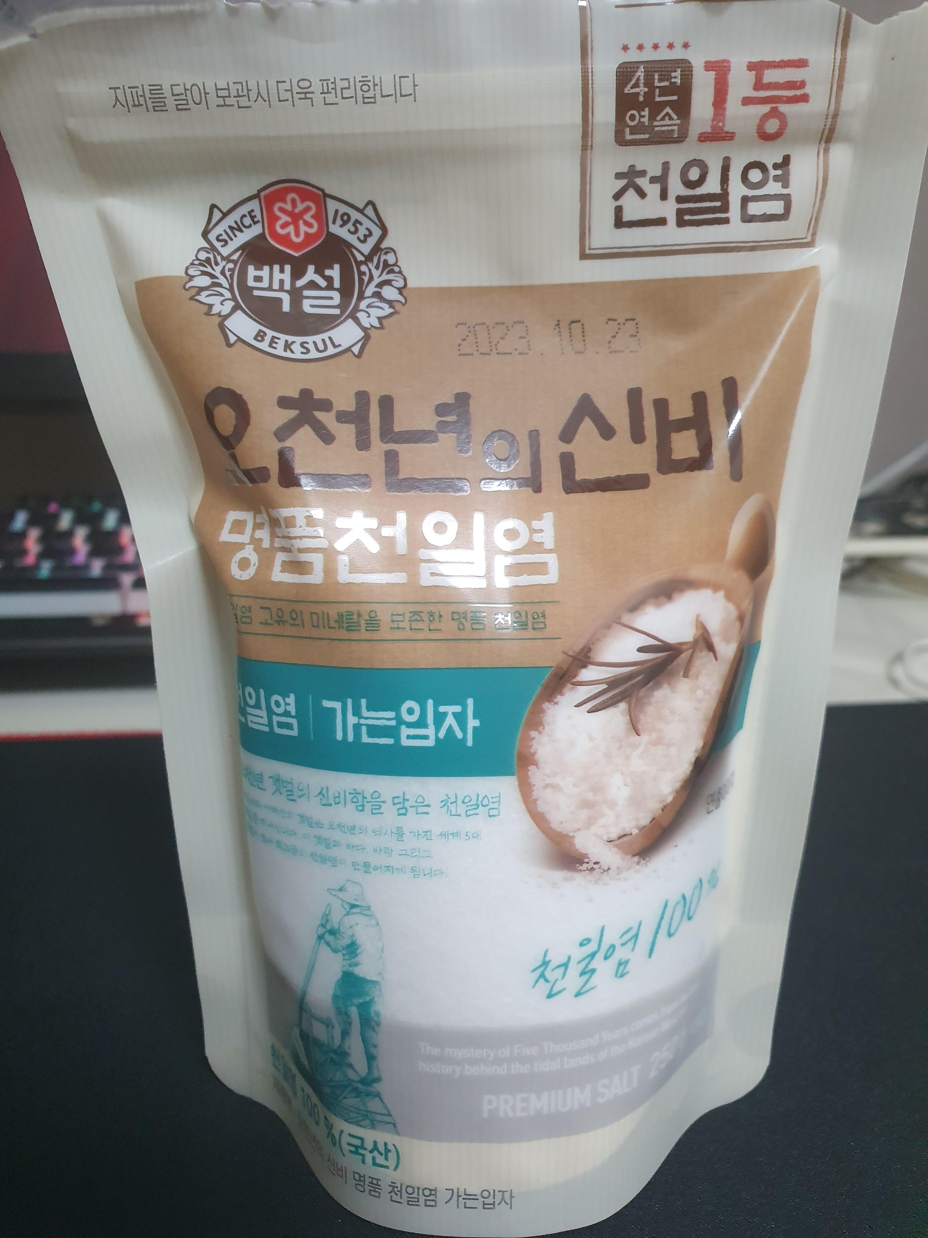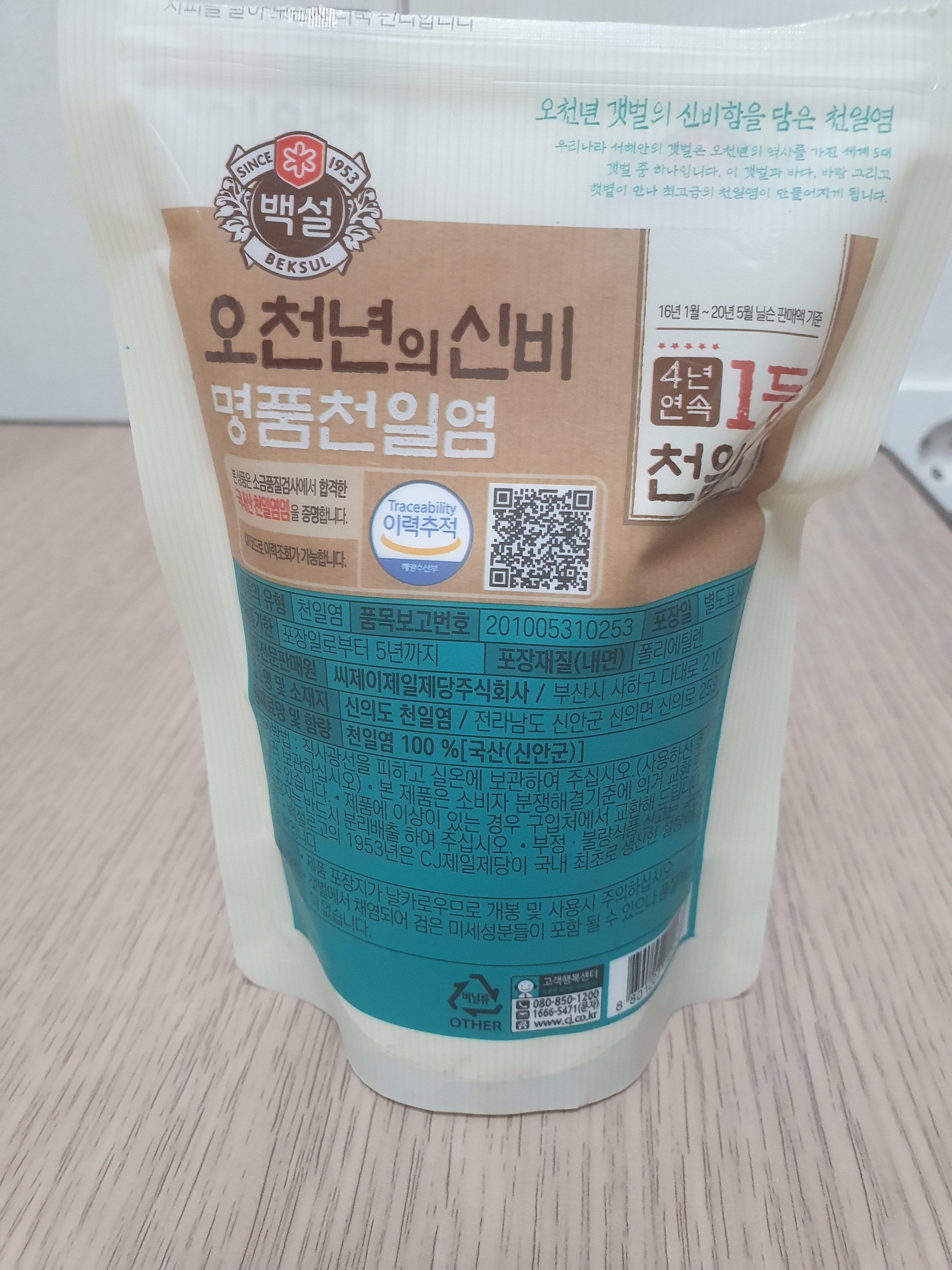 백설 제품이라 씨제이제일제당주식회사가 유통전문판매원으로 되어있다. 백설이 설탕이나 소금은 개인적으로 가장 베스트인 것 같다. 뭐 실제로 백설 소금이나 설탕을 사용하는 사람은, 아주 오래전부터 많긴 했다.