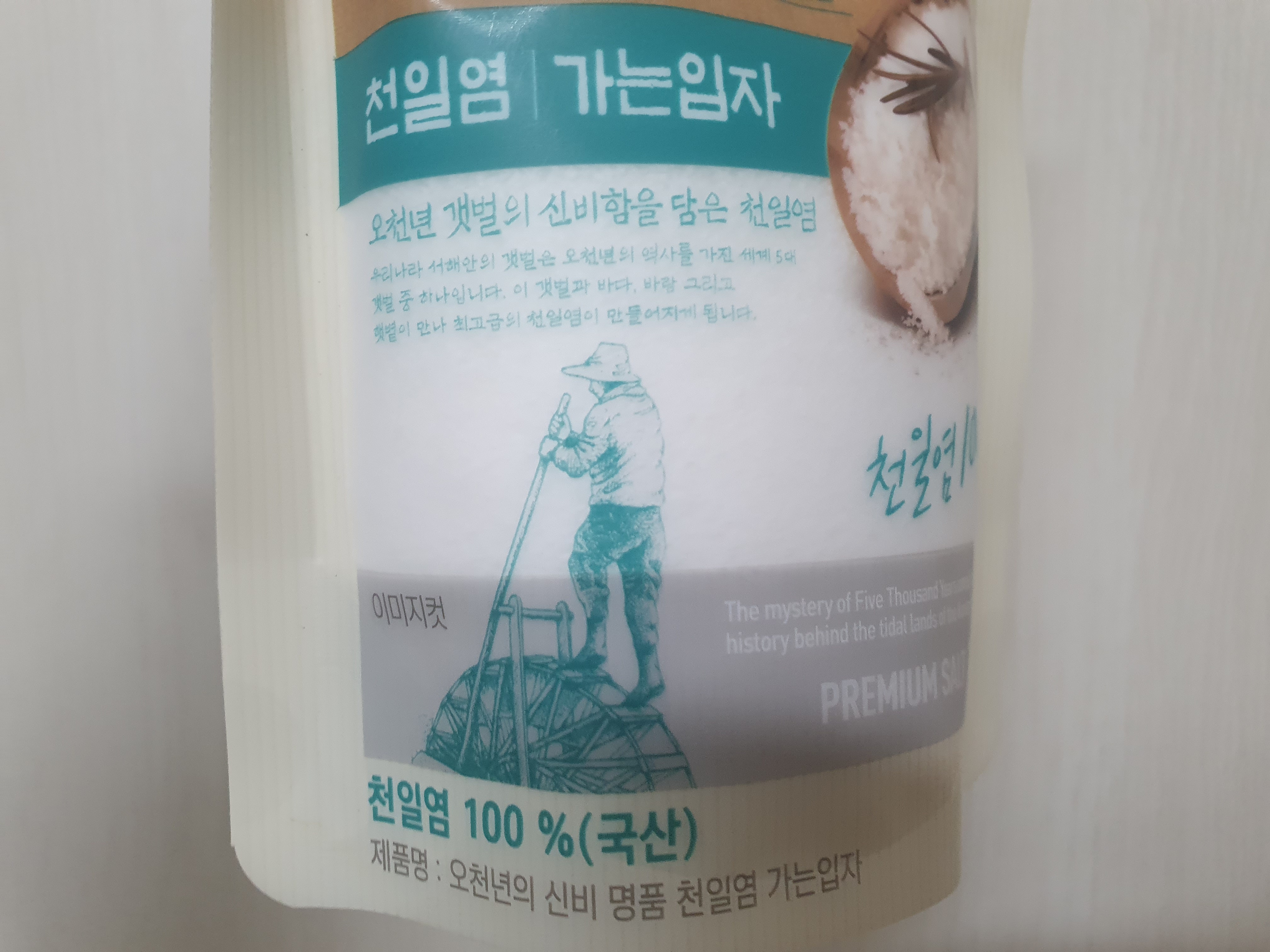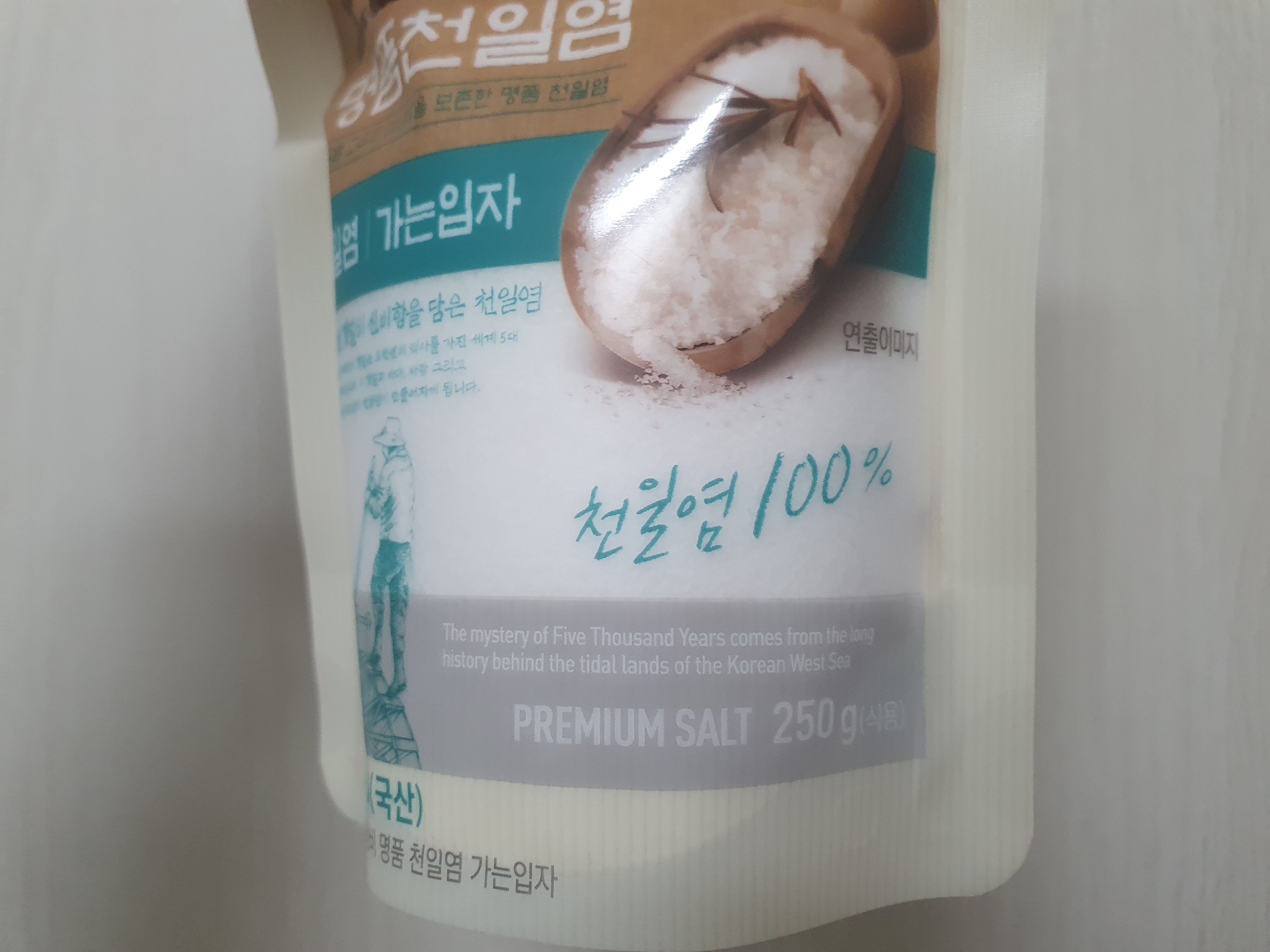 이게 이제 가격이 3000원 정도이다. 250g이고 가는입자라서 아주 꽉꽉 차있다. 천일염이라 앞서 말했듯이 맛은 굵은 소금과 크게 다르진 않다. 그냥 입자가 가늘다.