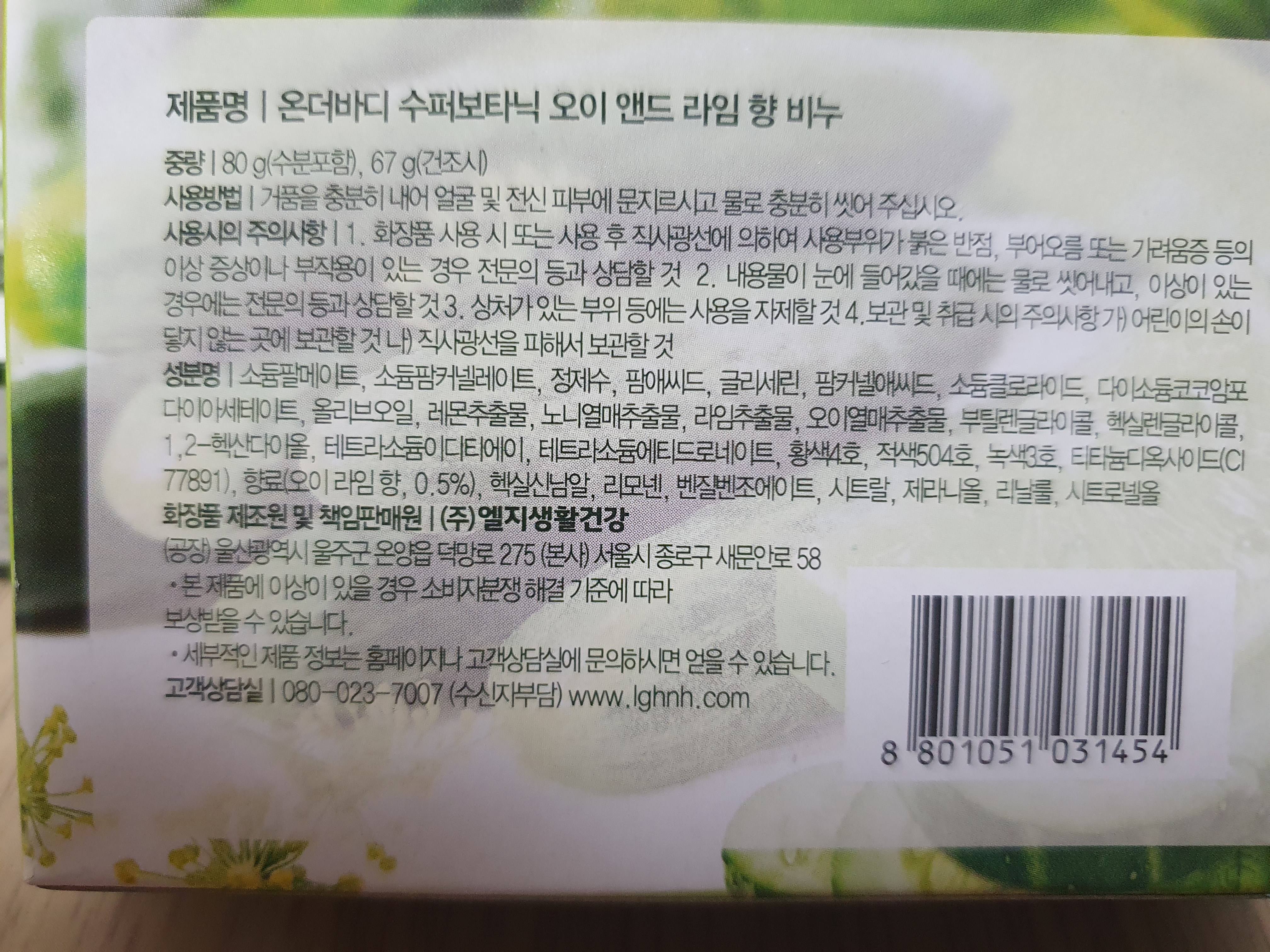 중량이 수분 포함 80g이고 건조시 67g이라고 한다. 얼굴과 전신에 사용이 가능하고 화장품 제조원 및 책임판매원은 '(주)엘지생활건강'이다.