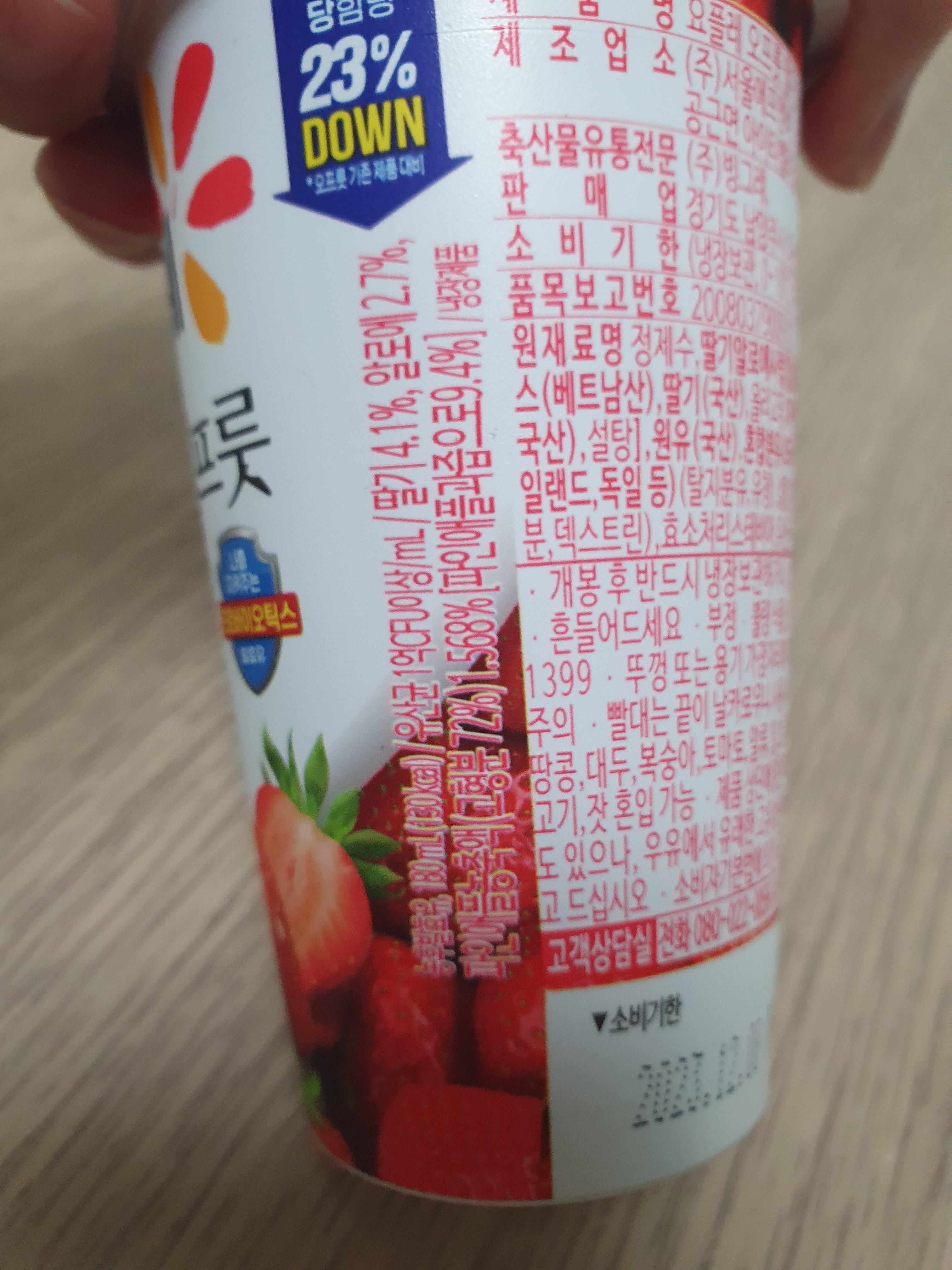 유산균은 1억CFU이상 포함하고 있다고 한다. 딸기 4.1%, 알로에 2.7%가 들어있다. 딸기하고 알로에의 조합이 진짜 좋은 것 같다. 앞으로 딸아 조합 좀 많이 찾아봐야겠다.
