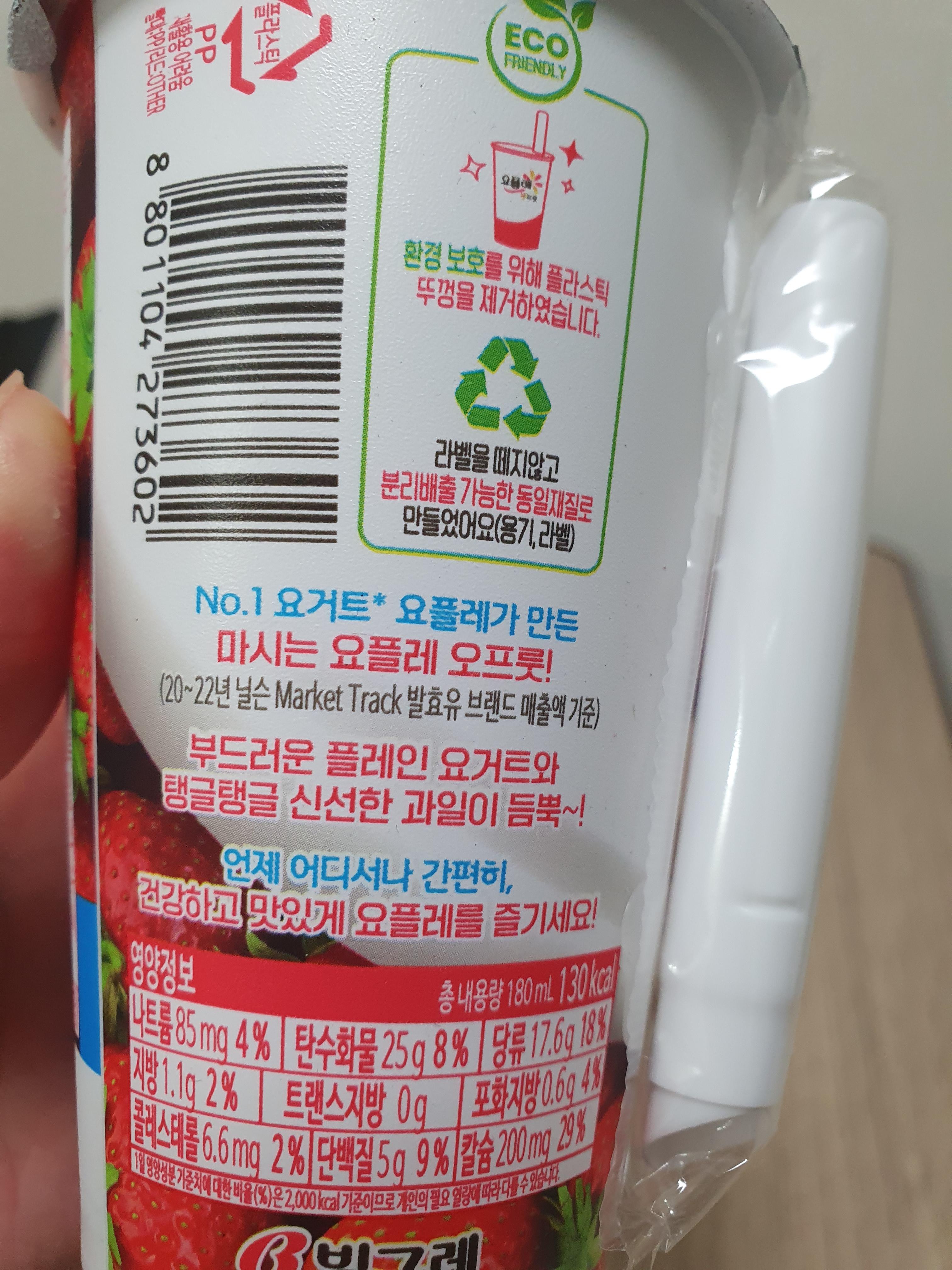 가격은 2200원 정도이다. 180g이고 칼로리는 130칼로리 정도 된다. 나를 지켜주는 프로바이오틱스 발효유라고 적혀있다. 맛은 기대 이상으로 내 취향이었는데 기본적인 맛은 요플레 딸기를 생각하면 되지만 여기서 '알로에'가 섞이면서 맛이 좀더 유해져서 적당한 달기를 보여준다.