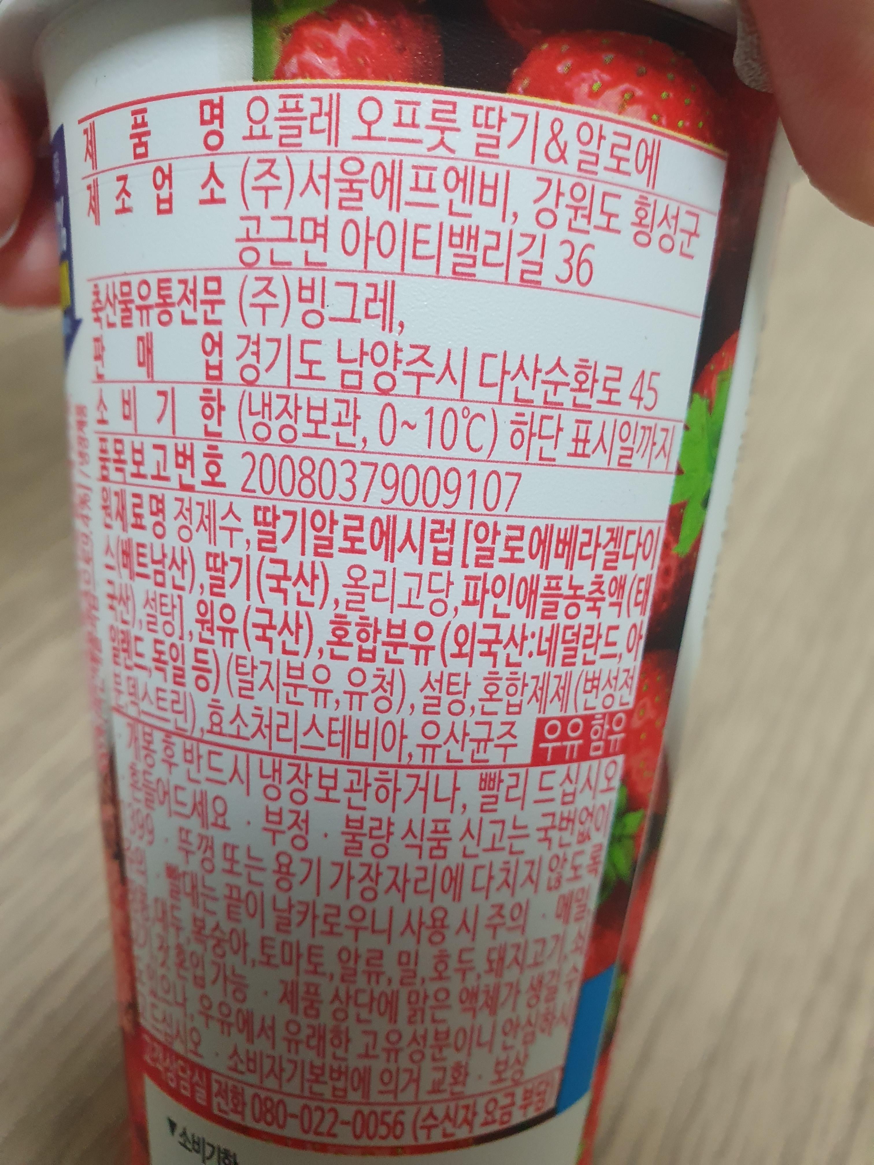요플레 오프룻 딸기&알로에는 제조업소가 '(주)서울에프엔비'이고 유통전문판매업은 '(주)빙그레'이다. 그냥 우리가 흔히 아는 그 빙그레 요플레 맞다.