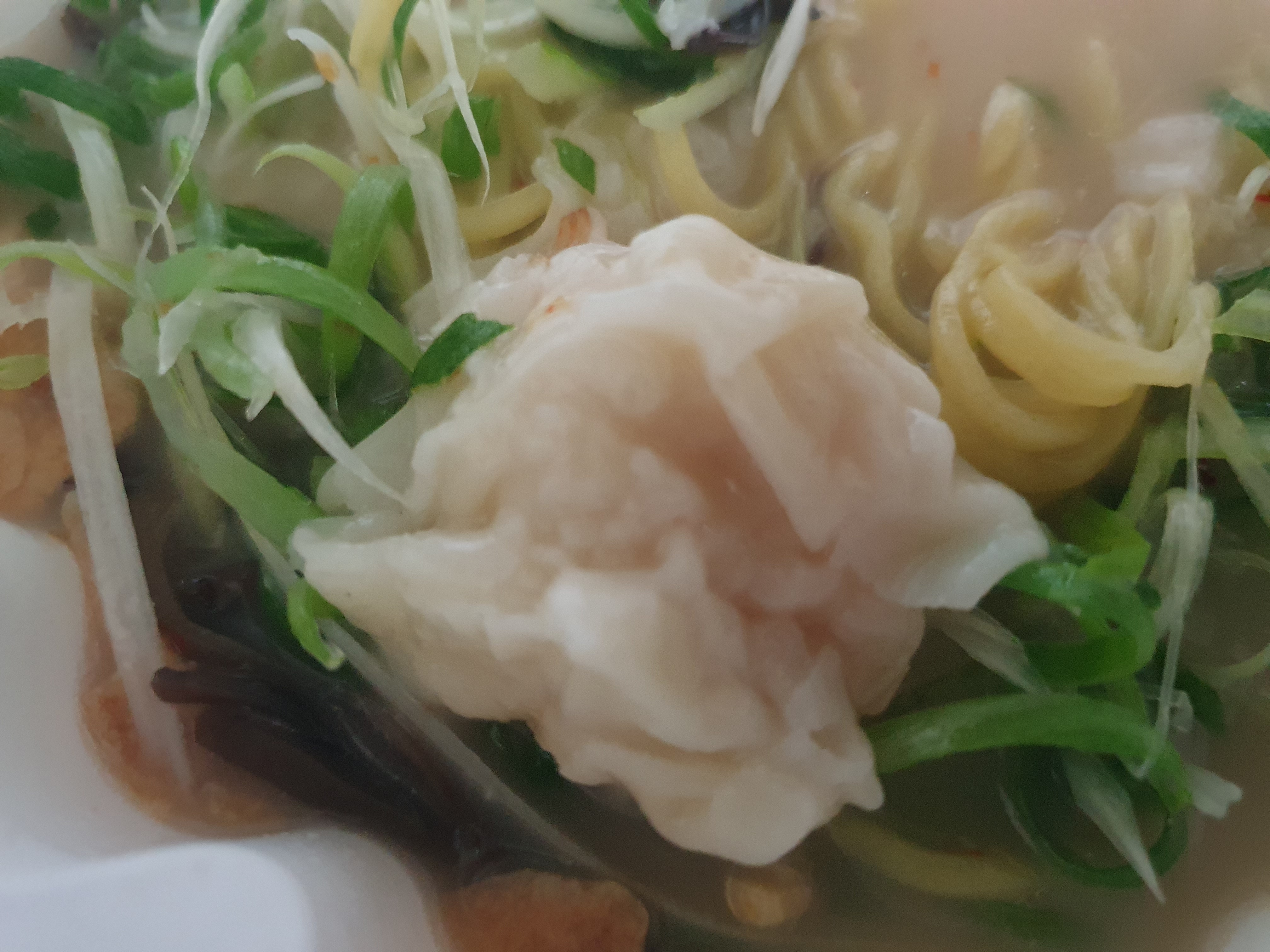 보다시피 새우완탕이 들어가있는데 이거 맛있어서 다음에 주문했을 때 추가해서 먹으려고 해보니까 3ea에 3000원이라 개당 1000원이었다. 후달달... 그래도 맛있긴 아주 맛있다. 새우살이 통통하니 톡톡 씹히고 피는 적당한 두께로 자글자글 주름이 있어서 식감이 아주 좋다. 전체적으로 탱글하면서 새우의 맛이 잘 느껴지는 새우완탕이었다.