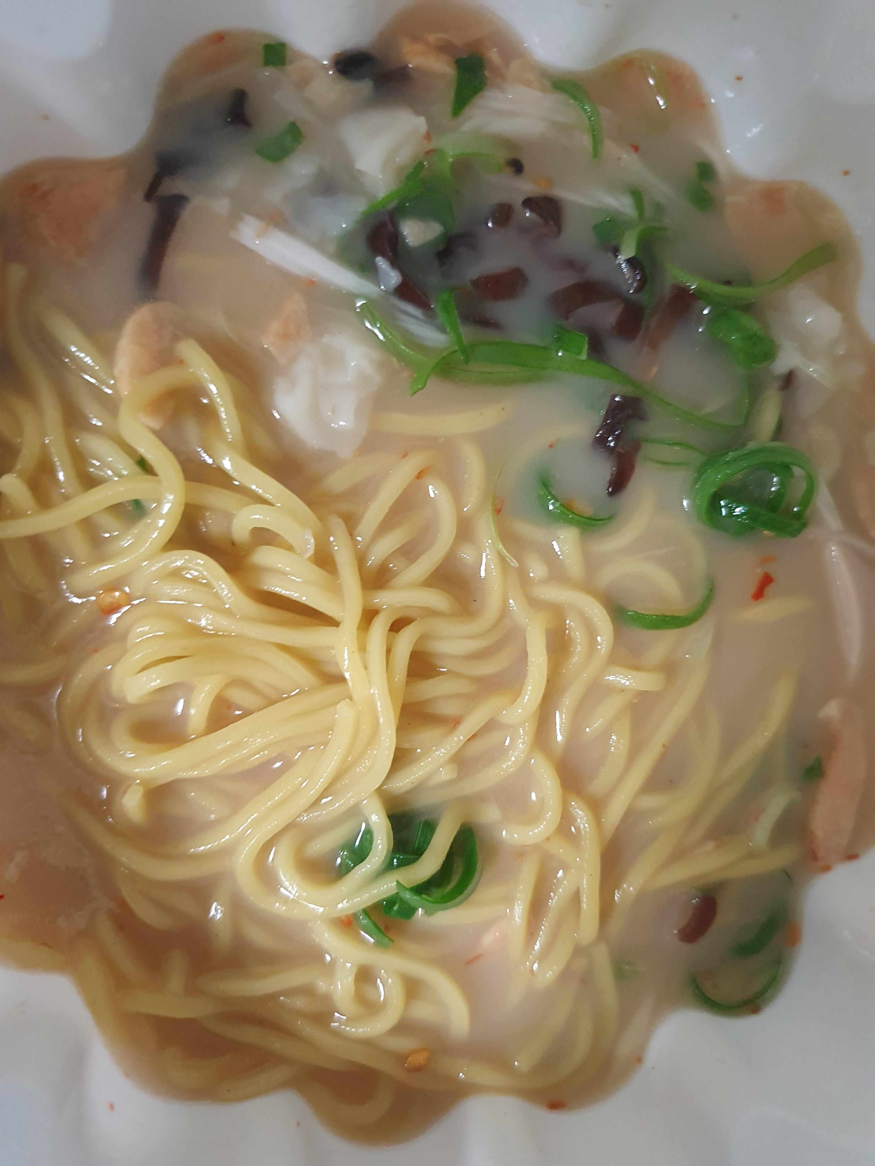 국물을 넣어주면 이런 비주얼이 된다. 새우완탕면이라서 맵지는 않다. 국물은 구수하면서 새우향이 나고 미소라멘처럼 국물이 진하고 고소하다. 맵지가 않기 때문에 아이들이 먹기도 좋은 것 같다. 옵션 선택에 보면 매콤한 레드페퍼를 뺄 수도 있어서 아이들 먹이기 좋은 것 같다.